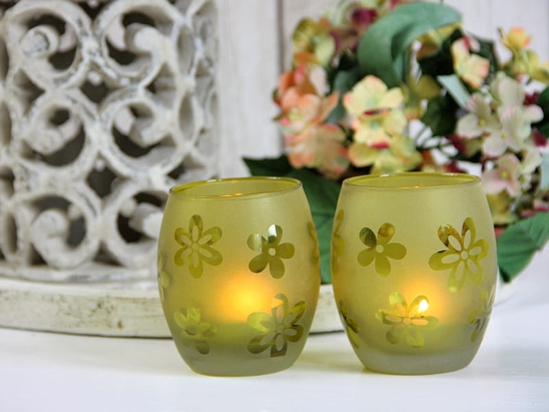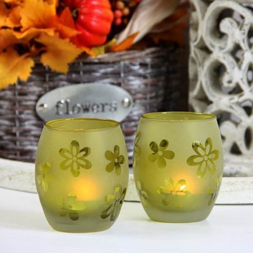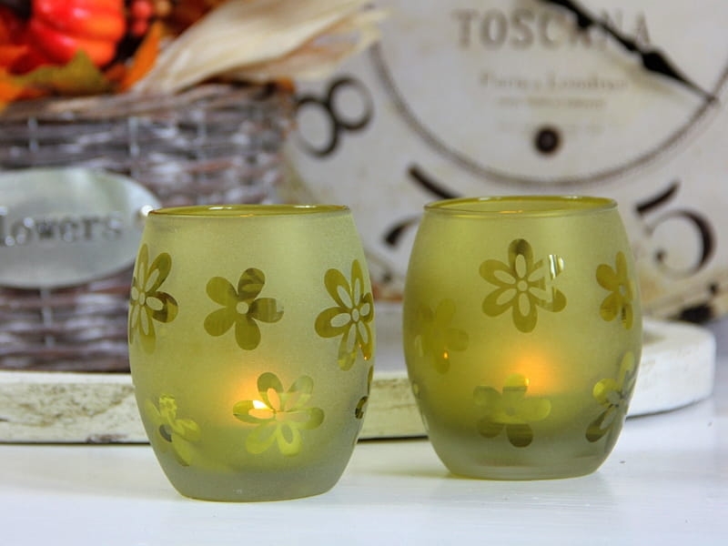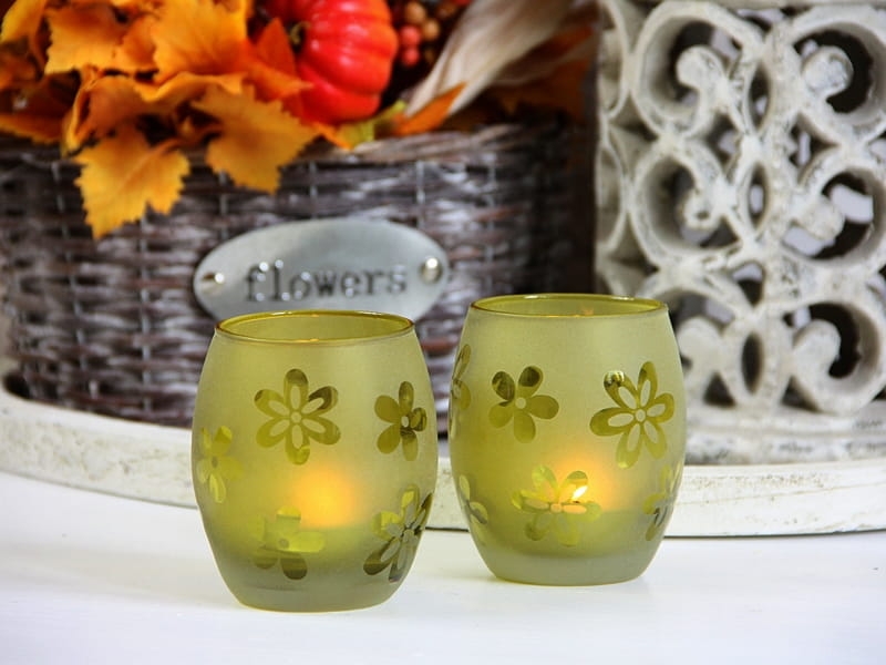 Efektowny świecznik na tea-light z dekoracyjnymi kwiatkami. Sprawdzi się jako element jesiennej aranżacji wnętrza lub jako ozdoba tarasu. Kolekcja składa się z czterech pięknych kolorów. Polecam jako ciekawy pomysł na prezent.