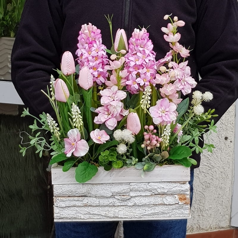 Wiosenna kompozycja wykonana z wysokiej jakości roślin, umieszczona w drewnianej donicy. Jest na tyle wąska, że bez problemu zmieści się na parapecie lub półce. Idealnie sprawdzi się jako ozdoba mieszkań zarówno w stylu klasycznym, jak i nowoczesnym. Wszystkie kompozycje są wykonywane ręcznie w naszej pracowni. Nie ma dwóch identycznych egzemplarzy. Mogą się minimalnie różnić rodzajem użytych kwiatów lub ich rozkładem. Kolorystyka jest jednak zawsze zachowana.