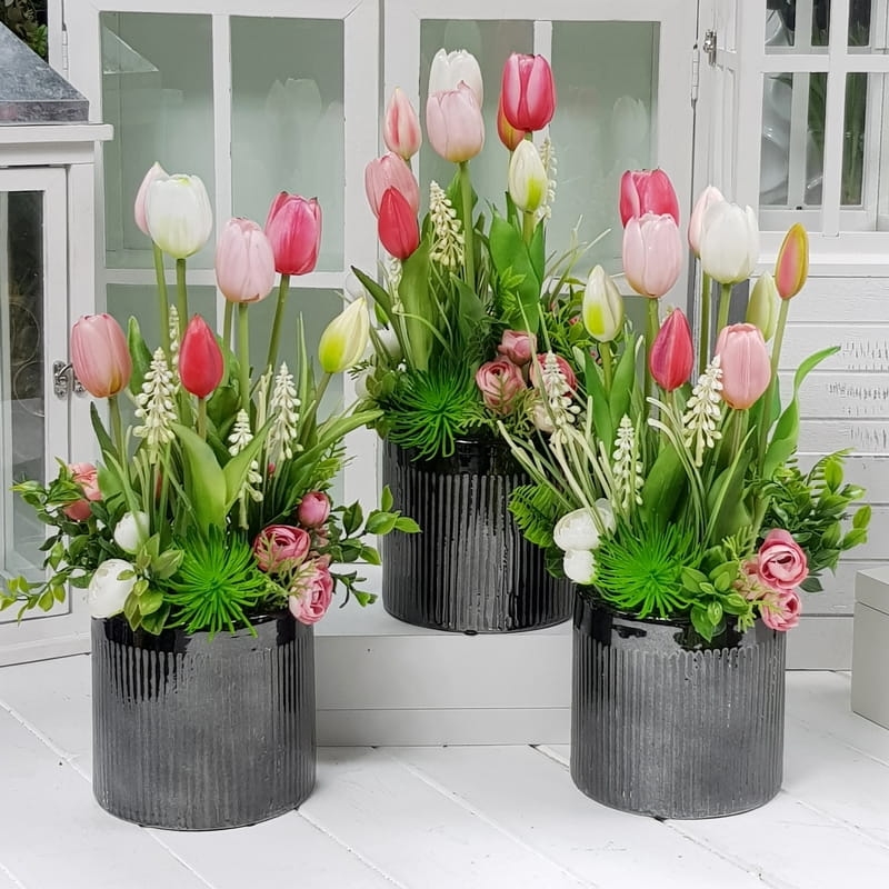 Wiosenna kompozycja wykonana z wysokiej jakości silikonowych tulipanów, umieszczona w ceramicznej donicy. Jest na tyle wąska, że bez problemu zmieści się na parapecie lub półce. Idealnie sprawdzi się jako ozdoba mieszkań zarówno w stylu klasycznym, jak i nowoczesnym. Donica jest zdobiona w nieregularne paski (nierówne, węższe i szersze). Wszelkie postarzenia i niedoskonałości to celowy zabieg.