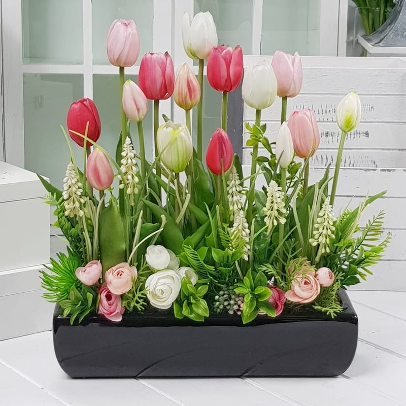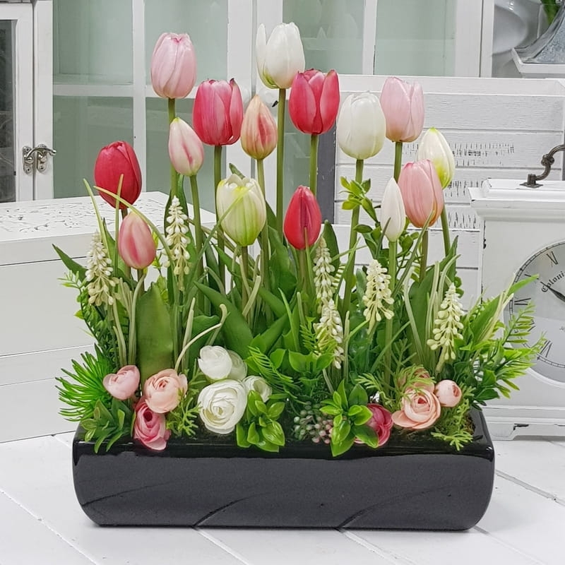 Wiosenna kompozycja wykonana z wysokiej jakości silikonowych tulipanów, umieszczona w ceramicznej donicy. Jest na tyle wąska, że bez problemu zmieści się na parapecie lub półce. Idealnie sprawdzi się jako ozdoba mieszkań zarówno w stylu klasycznym, jak i nowoczesnym. Polecamy jako oryginalny pomysł na prezent.