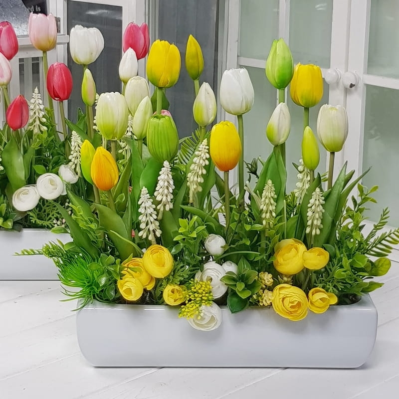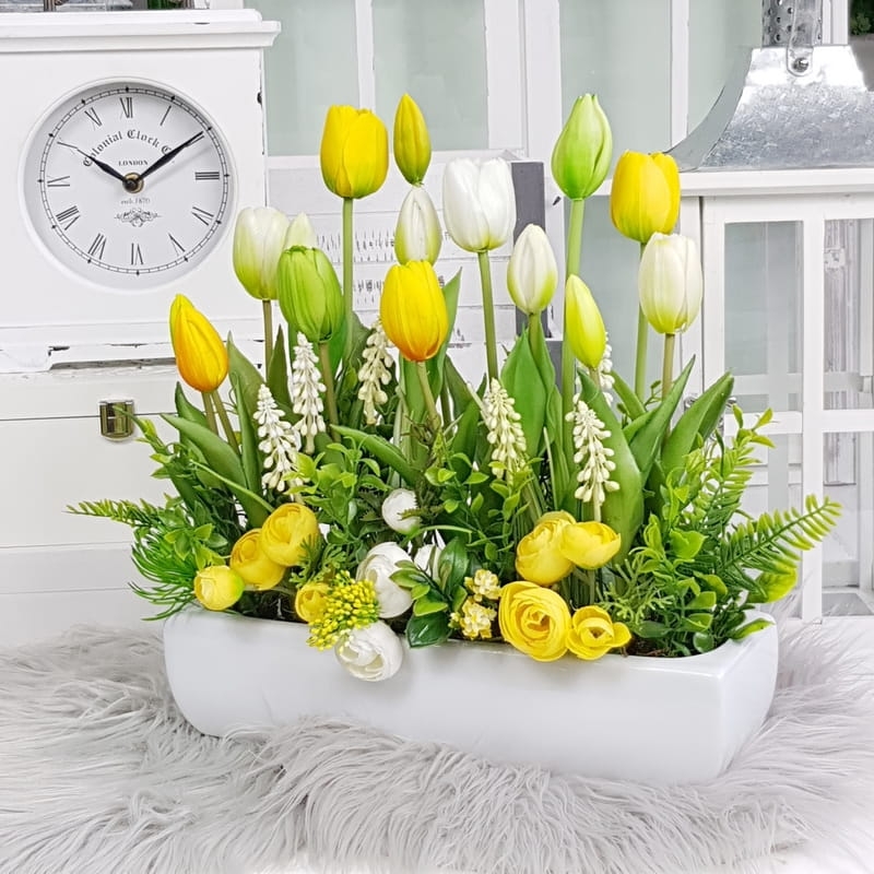 Wiosenna kompozycja wykonana z wysokiej jakości silikonowych tulipanów, umieszczona w ceramicznej donicy. Jest na tyle wąska, że bez problemu zmieści się na parapecie lub półce. Idealnie sprawdzi się jako ozdoba mieszkań zarówno w stylu klasycznym, jak i nowoczesnym. Wszystkie kompozycje są wykonywane ręcznie w naszej pracowni. Nie ma dwóch identycznych egzemplarzy. Mogą się minimalnie różnić rodzajem użytych kwiatów lub ich rozkładem. Kolorystyka jest jednak zawsze zachowana.