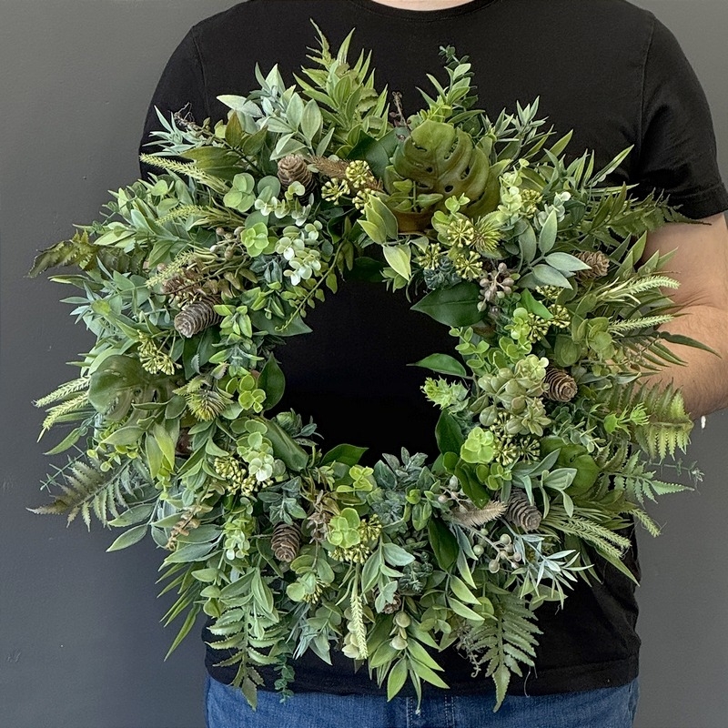 Elegancki wianek dekoracyjny w odcieniach zieleni to ponadczasowa propozycja do wnętrz, które cenią naturalność i świeżość. Kompozycja została wykonana ręcznie w pracowni Dekomotyw z wysokiej jakości sztucznych roślin – znajdziesz tu różnorodne liście, delikatne paprocie oraz ozdobne sukulenty, które tworzą efekt bujnej, realistycznej aranżacji.