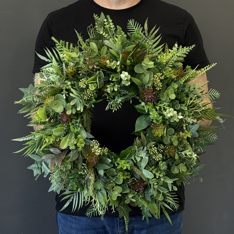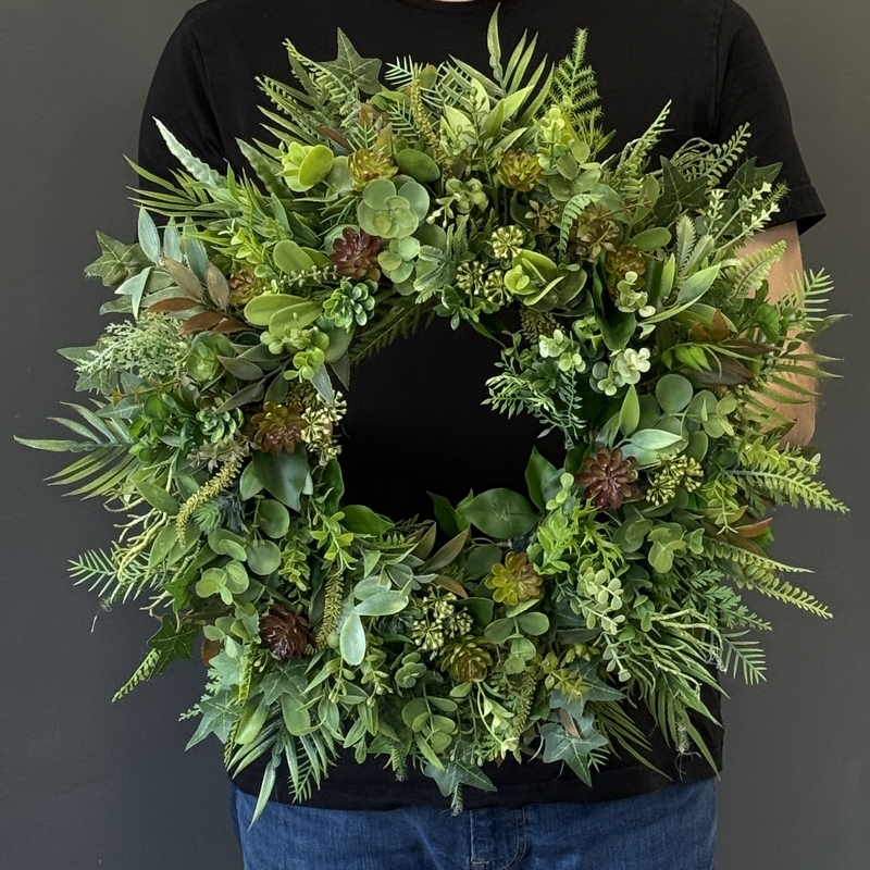 Elegancki wianek dekoracyjny w odcieniach zieleni to ponadczasowa propozycja do wnętrz, które cenią naturalność i świeżość. Kompozycja została wykonana ręcznie w pracowni Dekomotyw z wysokiej jakości sztucznych roślin – znajdziesz tu różnorodne liście, delikatne paprocie oraz ozdobne sukulenty, które tworzą efekt bujnej, realistycznej aranżacji.