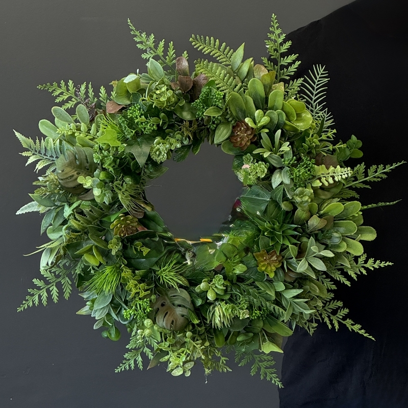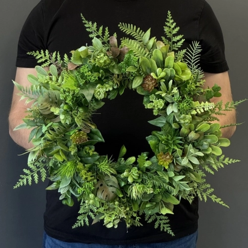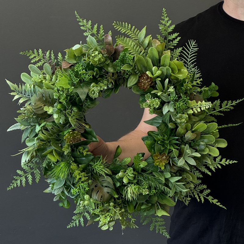 Elegancki wianek dekoracyjny w odcieniach zieleni to ponadczasowa propozycja do wnętrz, które cenią naturalność i świeżość. Kompozycja została wykonana ręcznie w pracowni Dekomotyw z wysokiej jakości sztucznych roślin – znajdziesz tu różnorodne liście, delikatne paprocie oraz ozdobne sukulenty, które tworzą efekt bujnej, realistycznej aranżacji.