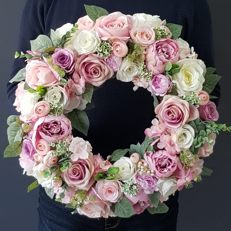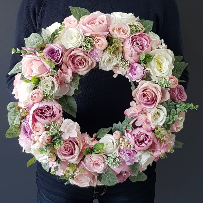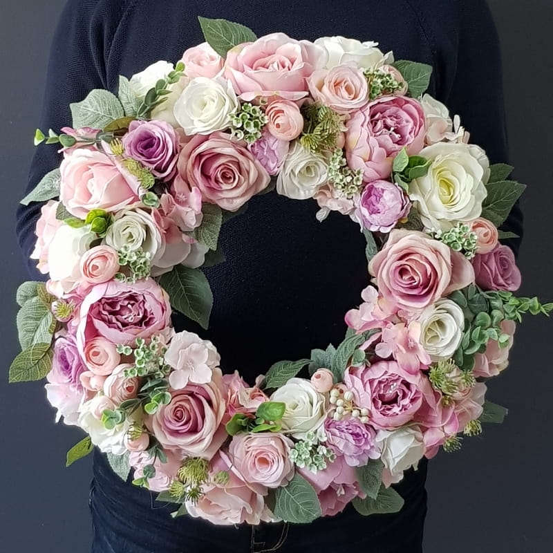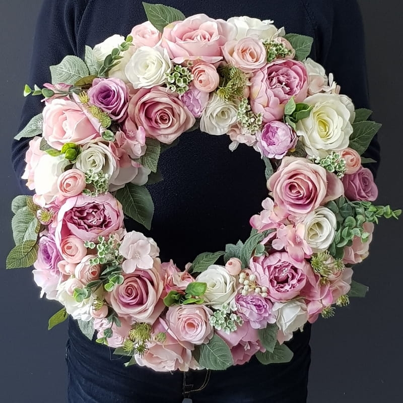 Oryginalny kwiatowy wianek wykonany z wysokiej jakości roślin sztucznych i dodatków. Całość jest stworzona z dbałością o najdrobniejszy szczegół. Podstawę stanowi wianek z wikliny. Wszystkie dodatki są idealnie dopasowane kolorystycznie tak, aby tworzyły spójną całość. Wianek nadaje się zarówno do powieszenia na drzwi, nad kominek jak i do położenia na płytę z dodatkiem znicza. Idealny do sesji fotograficznych. Wszystkie wianki są wykonywane ręcznie w naszej pracowni. Nie ma dwóch identycznych egzemplarzy. Mogą się minimalnie różnić rodzajem użytych kwiatów lub ich rozkładem. Kolorystyka jest jednak zawsze zachowana.