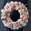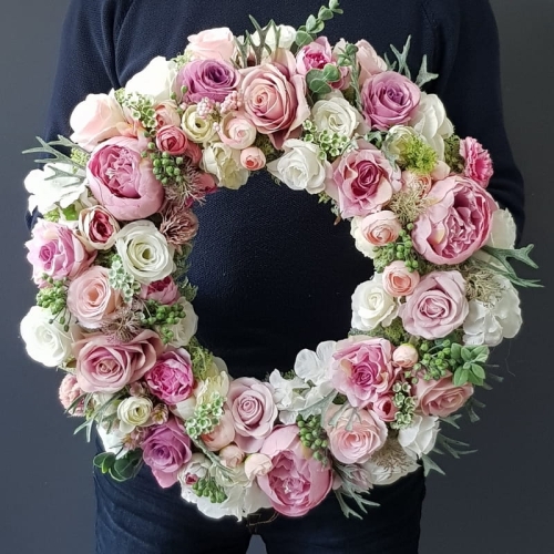 Oryginalny kwiatowy wianek wykonany z wysokiej jakości roślin sztucznych i dodatków. Całość jest stworzona z dbałością o najdrobniejszy szczegół. Podstawę stanowi zielony, liściasty wianek z tworzywa sztucznego. Wszystkie dodatki są idealnie dopasowane kolorystycznie tak, aby tworzyły spójną całość. Wianek nadaje się zarówno do powieszenia na drzwi, nad kominek jak i do położenia na płytę z dodatkiem znicza. Idealny do sesji fotograficznych. Wszystkie wianki są wykonywane ręcznie w naszej pracowni. Nie ma dwóch identycznych egzemplarzy. Mogą się minimalnie różnić rodzajem użytych kwiatów lub ich rozkładem. Kolorystyka jest jednak zawsze zachowana.