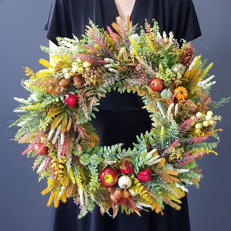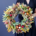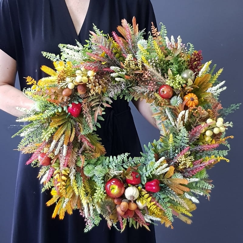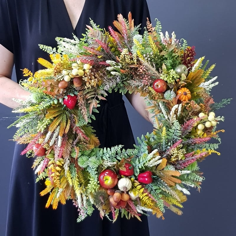 Oryginalny kwiatowy wianek wykonany z wysokiej jakości roślin sztucznych i dodatków. Całość jest stworzona z dbałością o najdrobniejszy szczegół. Podstawę stanowi zielony, liściasty wianek z tworzywa sztucznego. Wszystkie dodatki są idealnie dopasowane kolorystycznie tak, aby tworzyły spójną całość. Wianek nadaje się zarówno do powieszenia na drzwi, nad kominek jak i do położenia na płytę z dodatkiem znicza. Idealny do sesji fotograficznych.