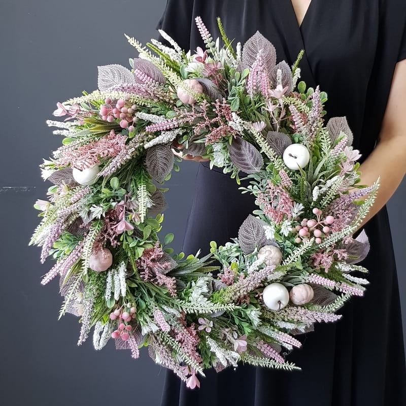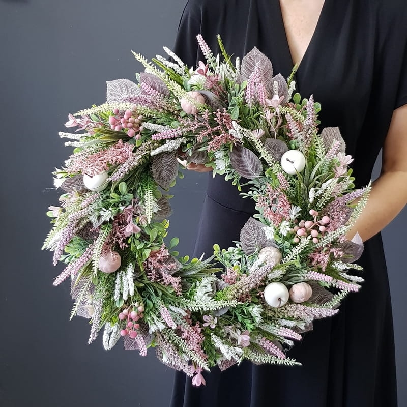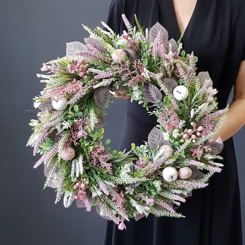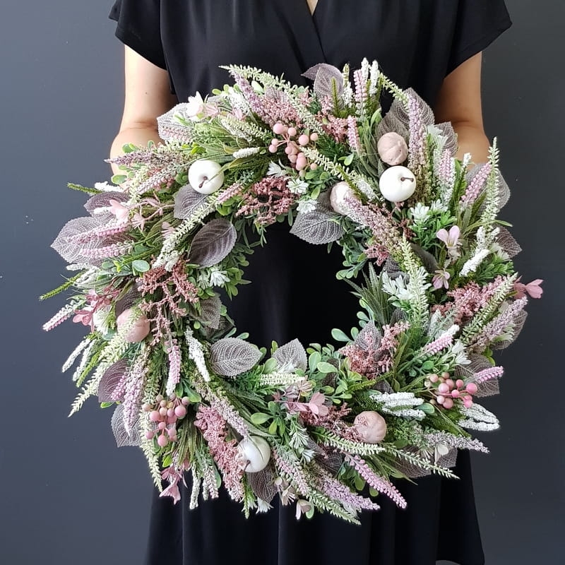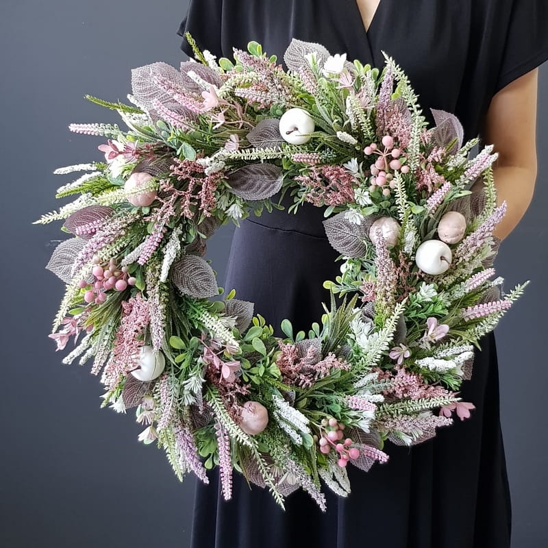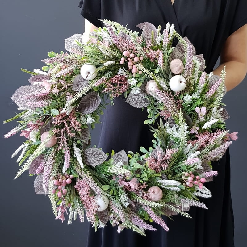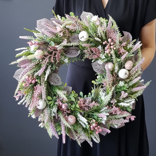 Oryginalny kwiatowy wianek wykonany z wysokiej jakości roślin sztucznych i dodatków. Całość jest stworzona z dbałością o najdrobniejszy szczegół. Podstawę stanowi zielony, liściasty wianek z tworzywa sztucznego. Wszystkie dodatki są idealnie dopasowane kolorystycznie tak, aby tworzyły spójną całość. Wianek nadaje się zarówno do powieszenia na drzwi, nad kominek jak i do położenia na płytę z dodatkiem znicza. Idealny do sesji fotograficznych.