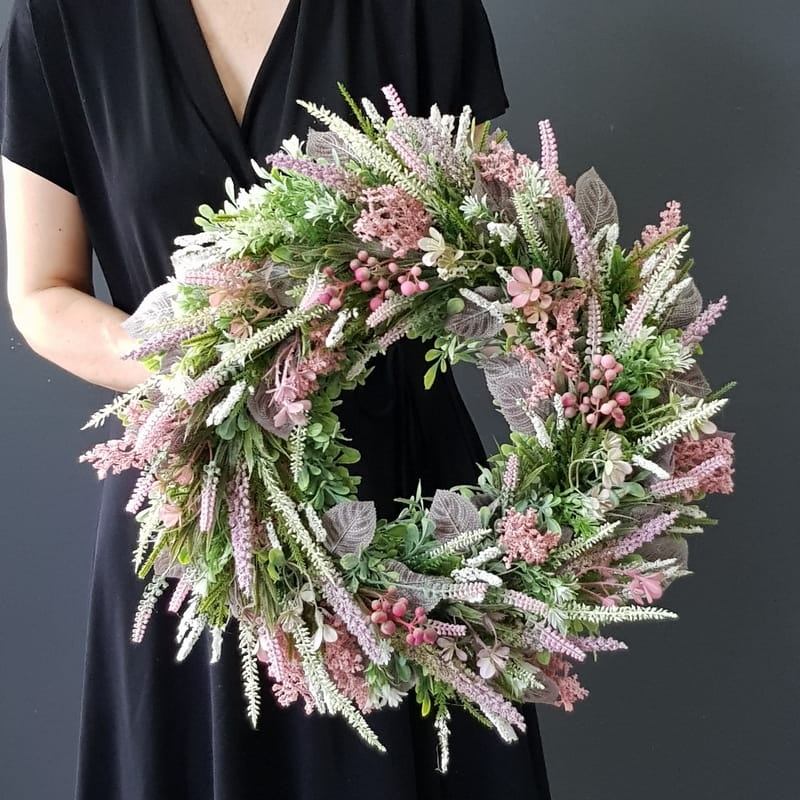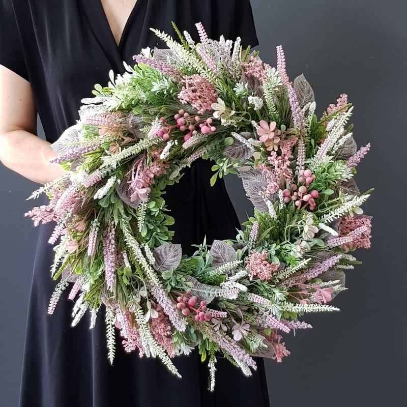 Oryginalny kwiatowy wianek wykonany z wysokiej jakości roślin sztucznych i dodatków. Całość jest stworzona z dbałością o najdrobniejszy szczegół. Podstawę stanowi zielony, liściasty wianek z tworzywa sztucznego. Wszystkie dodatki są idealnie dopasowane kolorystycznie tak, aby tworzyły spójną całość. Wianek nadaje się zarówno do powieszenia na drzwi, nad kominek jak i do położenia na płytę z dodatkiem znicza. Idealny do sesji fotograficznych.