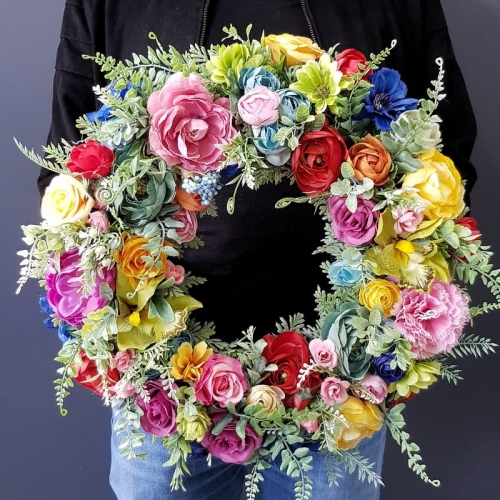 Oryginalny kwiatowy wianek wykonany z wysokiej jakości roślin sztucznych i dodatków. Całość jest stworzona z dbałością o najdrobniejszy szczegół. Podstawę stanowi zielony, liściasty wianek z tworzywa sztucznego. Wszystkie dodatki są idealnie dopasowane kolorystycznie tak, aby tworzyły spójną całość. Wianek nadaje się zarówno do powieszenia na drzwi, nad kominek jak i do położenia na płytę z dodatkiem znicza. Idealny do sesji fotograficznych.