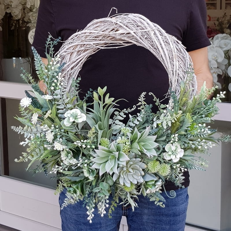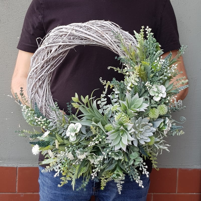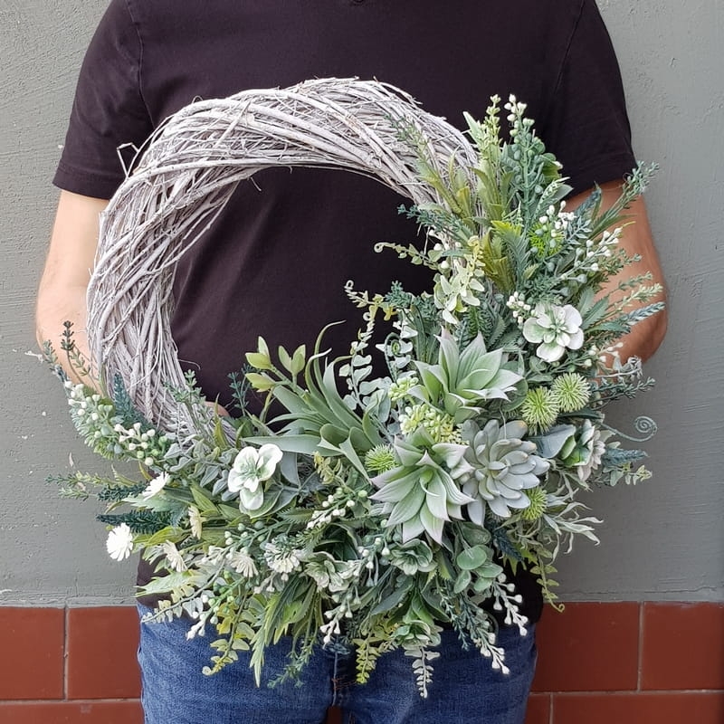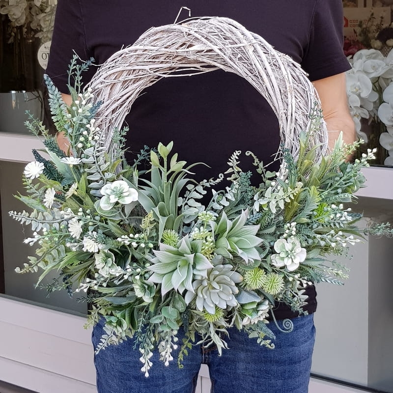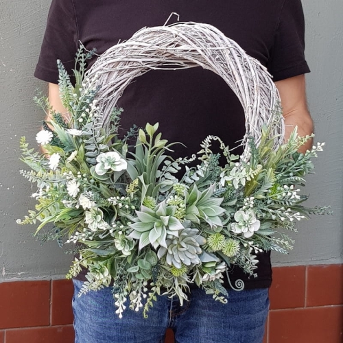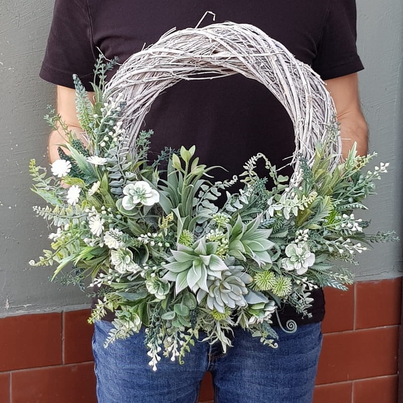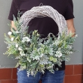 Oryginalny kwiatowy wianek wykonany z wysokiej jakości roślin sztucznych i dodatków. Całość jest stworzona z dbałością o najdrobniejszy szczegół. Wszystkie dodatki są idealnie dopasowane kolorystycznie tak, aby tworzyły spójną całość. Wszystkie wianki są wykonywane ręcznie w naszej pracowni. Mogą więc minimalnie różnić się rozkładem poszczególnych dodatków. Wianek nadaje się do powieszenia na drzwi, nad kominek lub na ścianę.