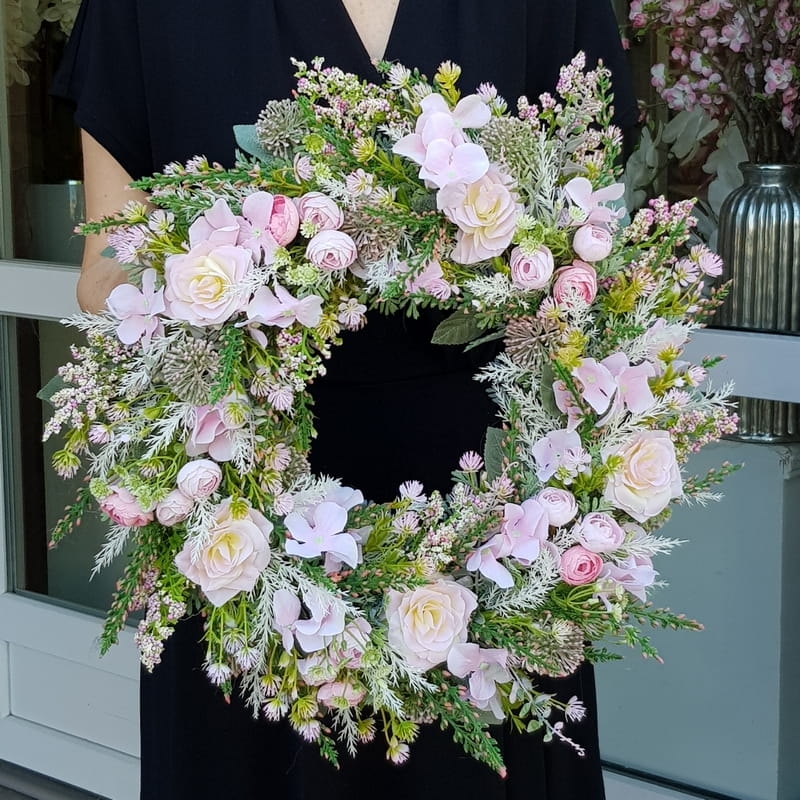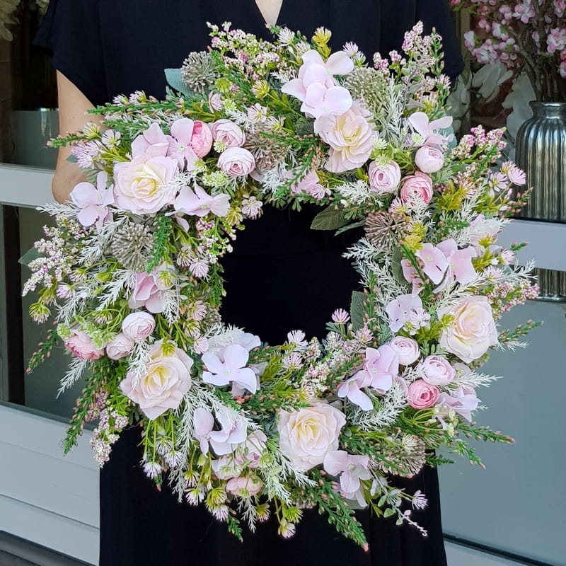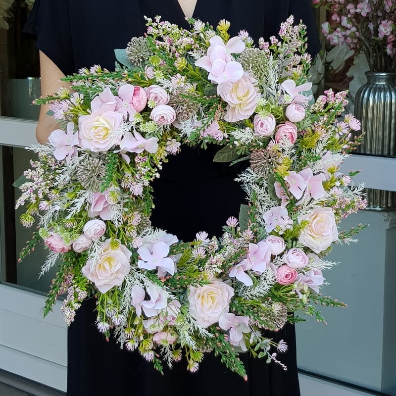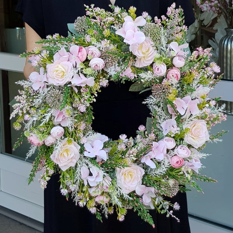 Oryginalny kwiatowy wianek wykonany z wysokiej jakości roślin sztucznych i dodatków. Całość jest stworzona z dbałością o najdrobniejszy szczegół. Podstawę stanowi wianek z tworzywa sztucznego. Wszystkie dodatki są idealnie dopasowane kolorystycznie tak, aby tworzyły spójną całość. Wianek nadaje się zarówno do powieszenia na drzwi, nad kominek jak i do położenia na płytę z dodatkiem znicza. Idealny do sesji fotograficznych.