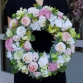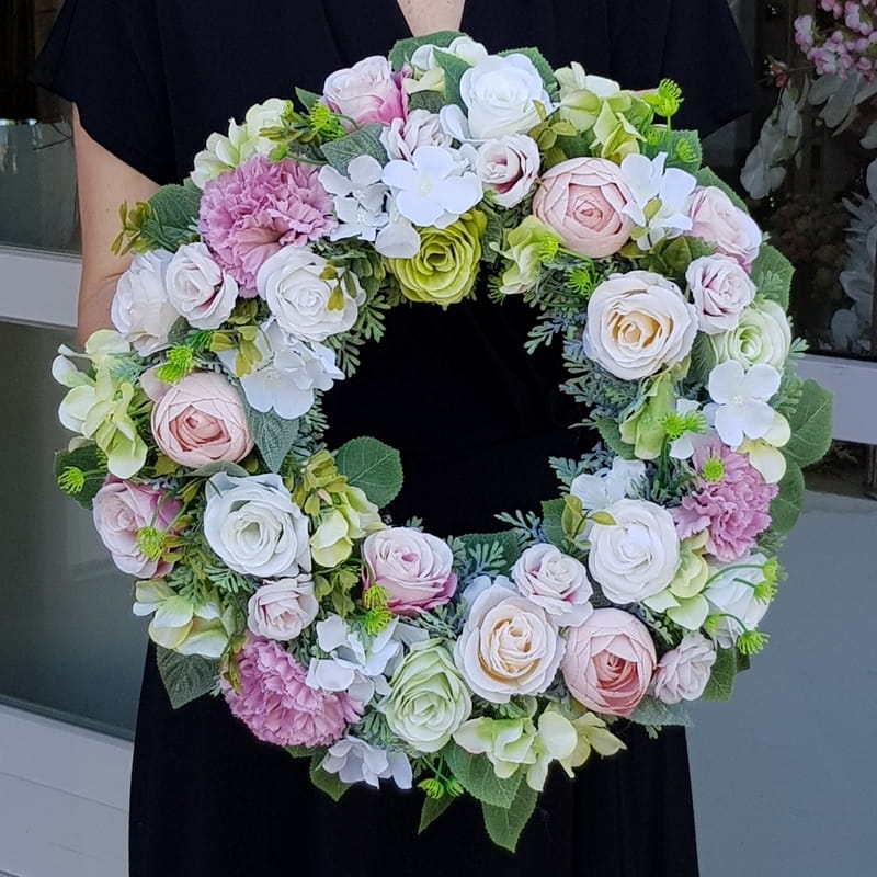 Oryginalny kwiatowy wianek wykonany z wysokiej jakości roślin sztucznych i dodatków. Całość jest stworzona z dbałością o najdrobniejszy szczegół. Podstawę stanowi wianek z tworzywa sztucznego. Wszystkie dodatki są idealnie dopasowane kolorystycznie tak, aby tworzyły spójną całość. Wianek nadaje się zarówno do powieszenia na drzwi, nad kominek jak i do położenia na płytę z dodatkiem znicza. Idealny do sesji fotograficznych.