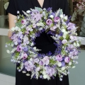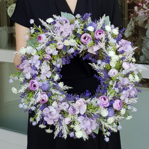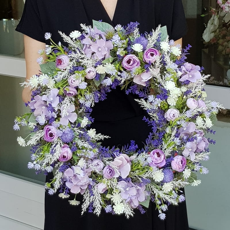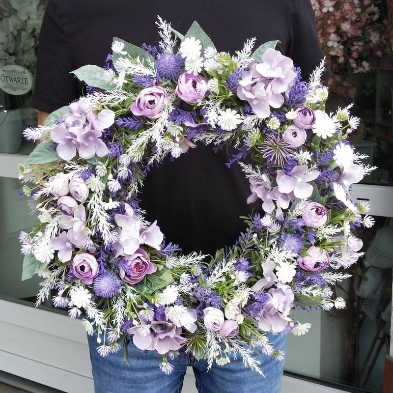 Oryginalny kwiatowy wianek wykonany z wysokiej jakości roślin sztucznych i dodatków. Całość jest stworzona z dbałością o najdrobniejszy szczegół. Podstawę stanowi wianek z tworzywa sztucznego. Wszystkie dodatki są idealnie dopasowane kolorystycznie tak, aby tworzyły spójną całość. Wianek nadaje się zarówno do powieszenia na drzwi, nad kominek jak i do położenia na płytę z dodatkiem znicza. Idealny do sesji fotograficznych.