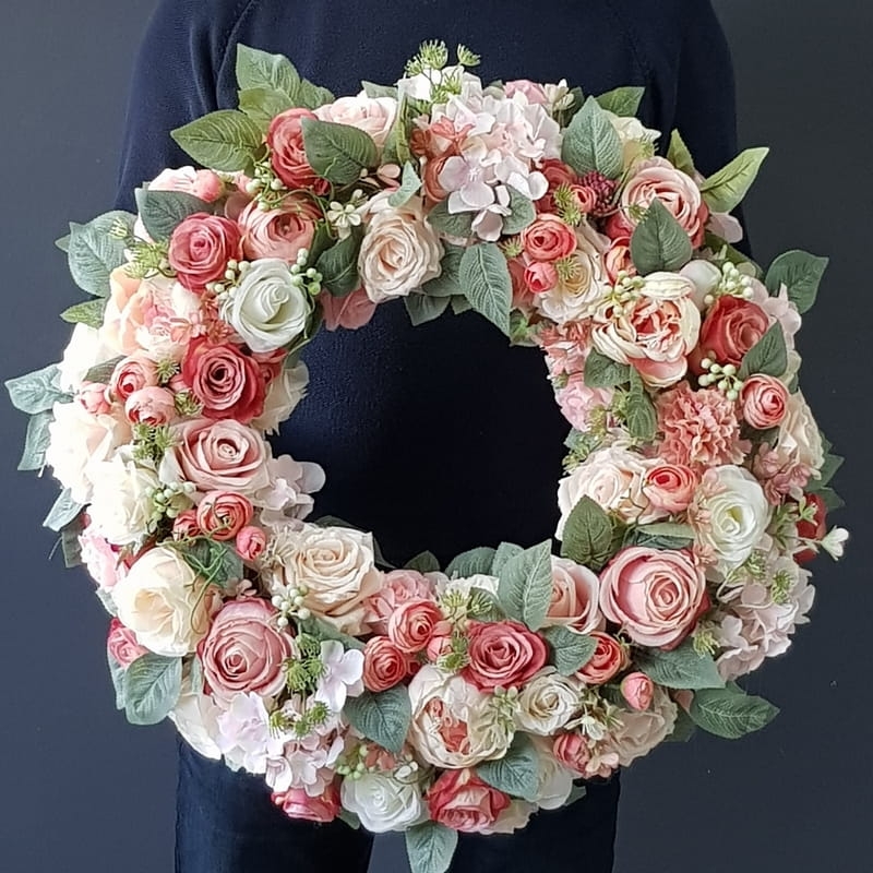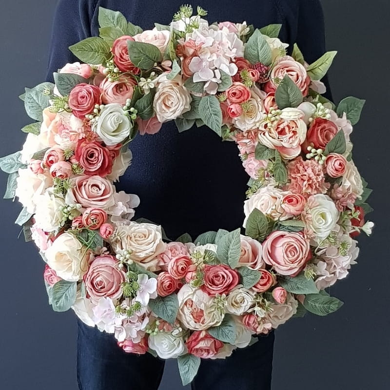 Oryginalny kwiatowy wianek wykonany z wysokiej jakości roślin sztucznych i dodatków. Całość jest stworzona z dbałością o najdrobniejszy szczegół. Podstawę stanowi wianek z wikliny. Wszystkie dodatki są idealnie dopasowane kolorystycznie tak, aby tworzyły spójną całość. Wianek nadaje się zarówno do powieszenia na drzwi, nad kominek jak i do położenia na płytę z dodatkiem znicza. Idealny do sesji fotograficznych. Wszystkie wianki są wykonywane ręcznie w naszej pracowni. Nie ma dwóch identycznych egzemplarzy. Mogą się minimalnie różnić rodzajem użytych kwiatów lub ich rozkładem. Kolorystyka jest jednak zawsze zachowana.