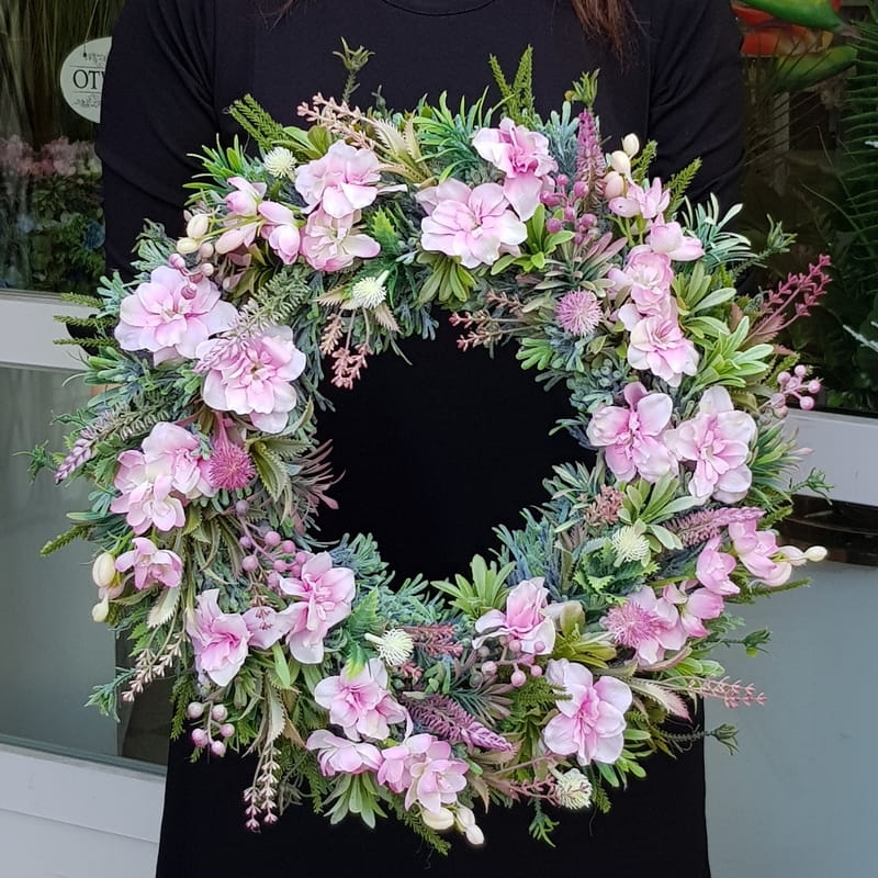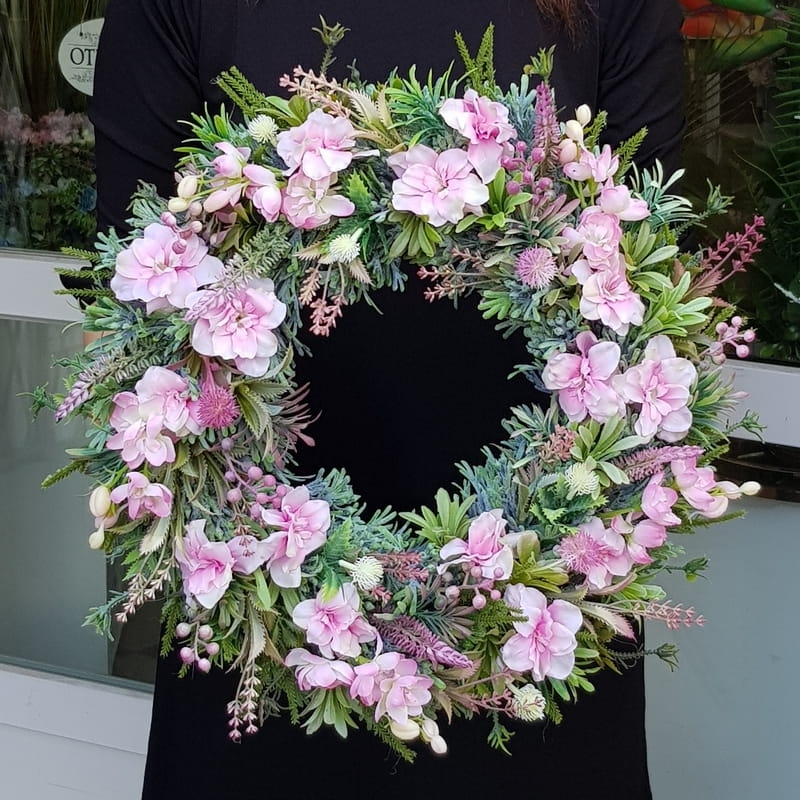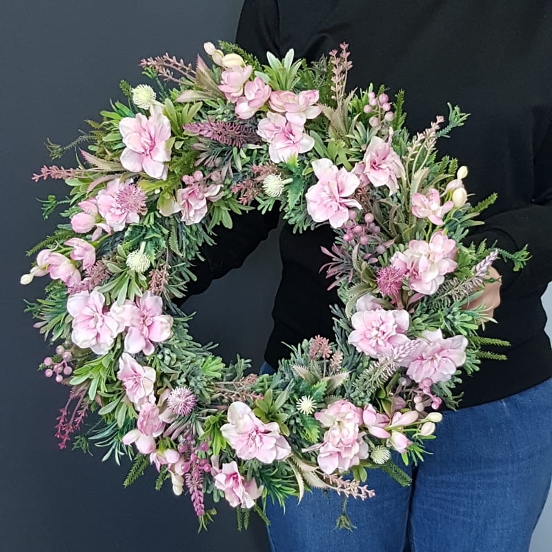 Oryginalny kwiatowy wianek wykonany z wysokiej jakości roślin sztucznych i dodatków. Całość jest stworzona z dbałością o najdrobniejszy szczegół. Podstawę stanowi wianek z tworzywa sztucznego. Wszystkie dodatki są idealnie dopasowane kolorystycznie tak, aby tworzyły spójną całość. Wianek nadaje się zarówno do powieszenia na drzwi, nad kominek jak i do położenia na płytę z dodatkiem znicza. Idealny do sesji fotograficznych.