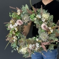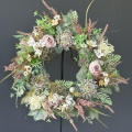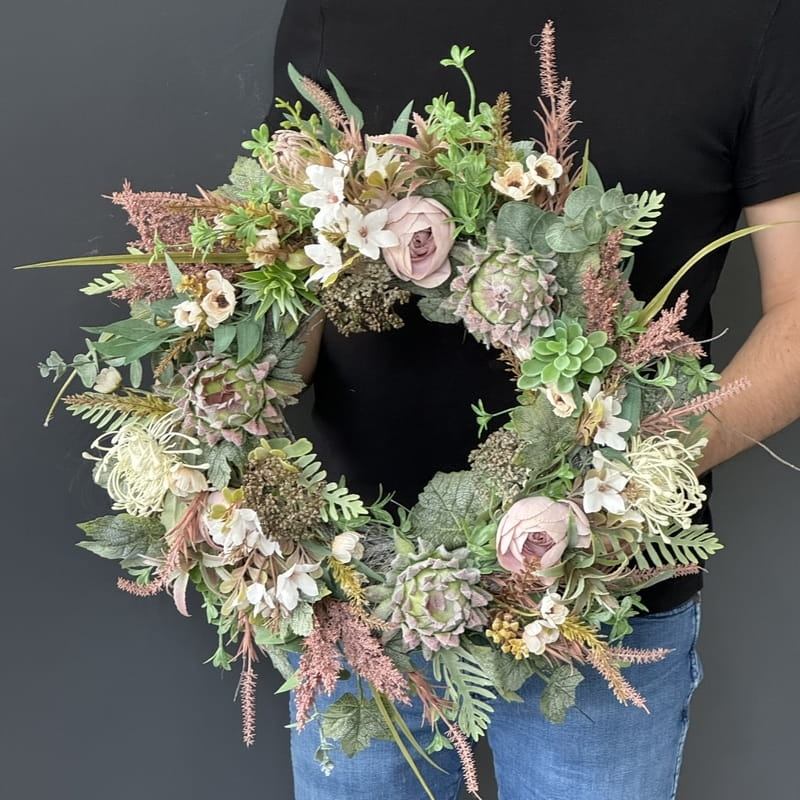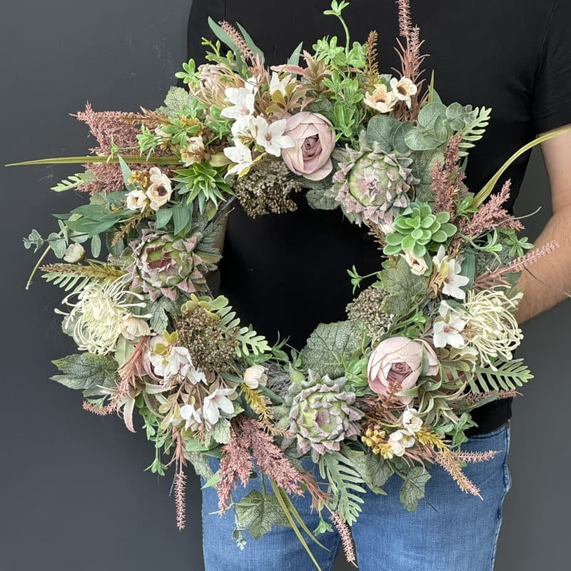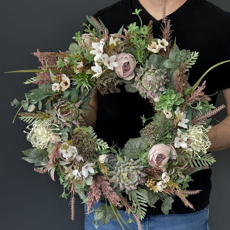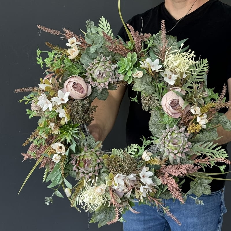 Oryginalny kwiatowy wianek wykonany z wysokiej jakości roślin sztucznych i dodatków. Całość jest stworzona z dbałością o najdrobniejszy szczegół. Podstawę stanowi wianek z faszyny. Wszystkie dodatki są idealnie dopasowane kolorystycznie tak, aby tworzyły spójną całość. Wianek nadaje się zarówno do powieszenia na drzwi, nad kominek jak i do położenia na płytę z dodatkiem znicza. Idealny do sesji fotograficznych.