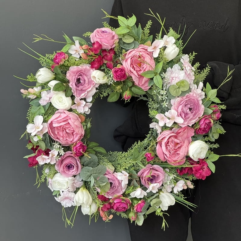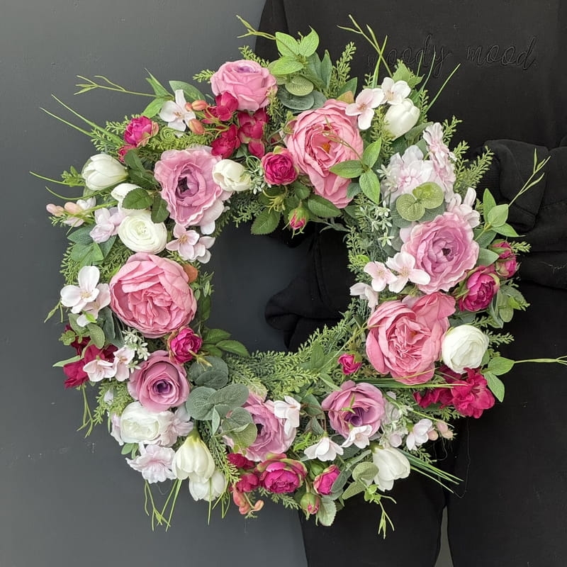 Oryginalny kwiatowy wianek wykonany z wysokiej jakości roślin sztucznych i dodatków. Całość jest stworzona z dbałością o najdrobniejszy szczegół. Podstawę stanowi wianek z tworzywa sztucznego. Wszystkie dodatki są idealnie dopasowane kolorystycznie tak, aby tworzyły spójną całość. Wianek nadaje się zarówno do powieszenia na drzwi, nad kominek jak i do położenia na płytę z dodatkiem znicza. Idealny do sesji fotograficznych.