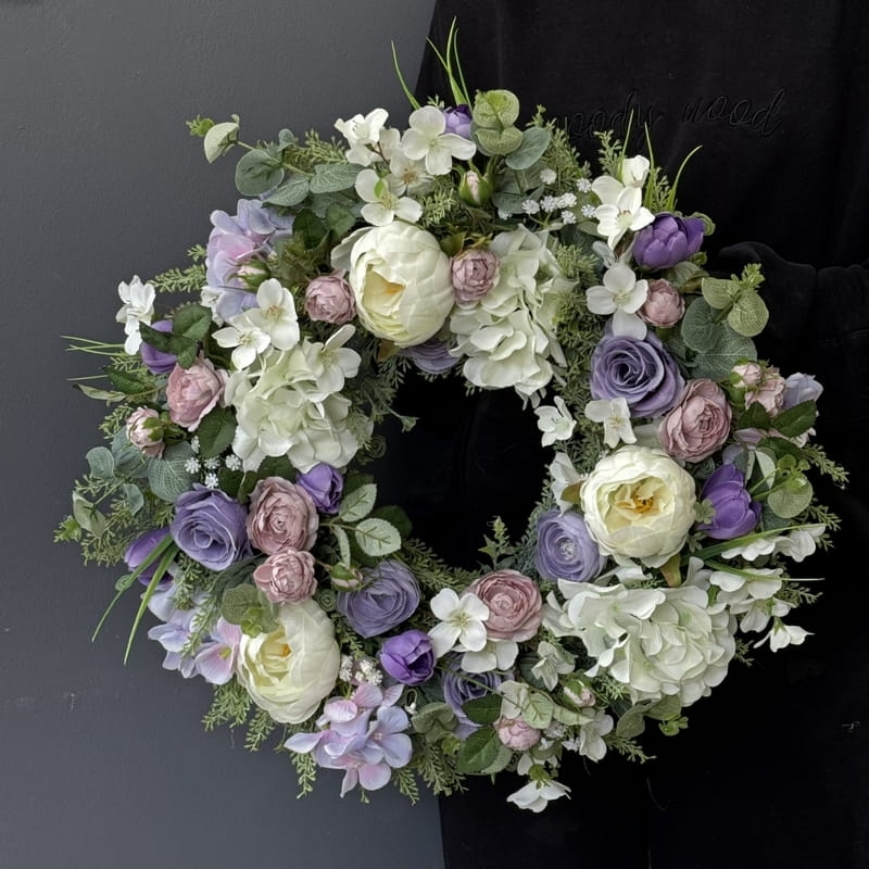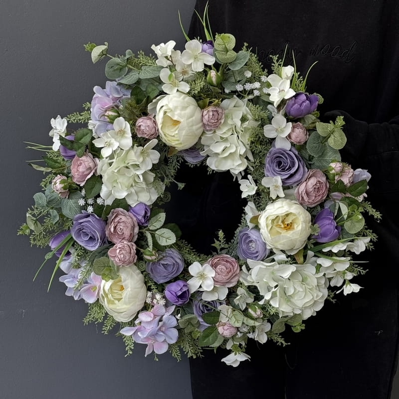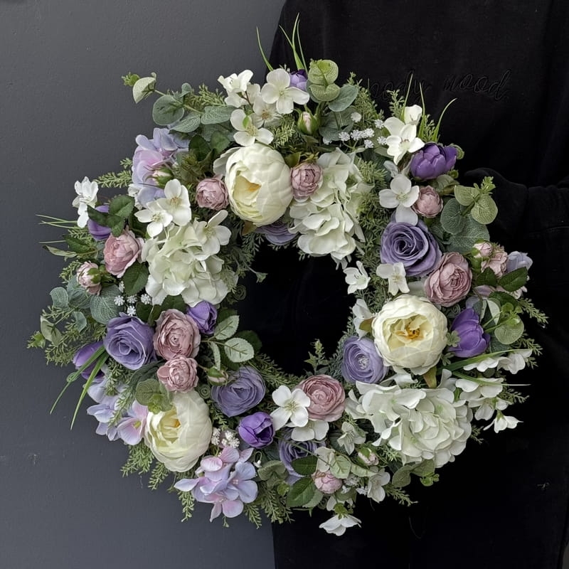 Oryginalny kwiatowy wianek wykonany z wysokiej jakości roślin sztucznych i dodatków. Całość jest stworzona z dbałością o najdrobniejszy szczegół. Podstawę stanowi wianek z tworzywa sztucznego. Wszystkie dodatki są idealnie dopasowane kolorystycznie tak, aby tworzyły spójną całość. Wianek nadaje się zarówno do powieszenia na drzwi, nad kominek jak i do położenia na płytę z dodatkiem znicza. Idealny do sesji fotograficznych.