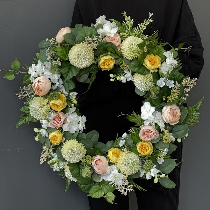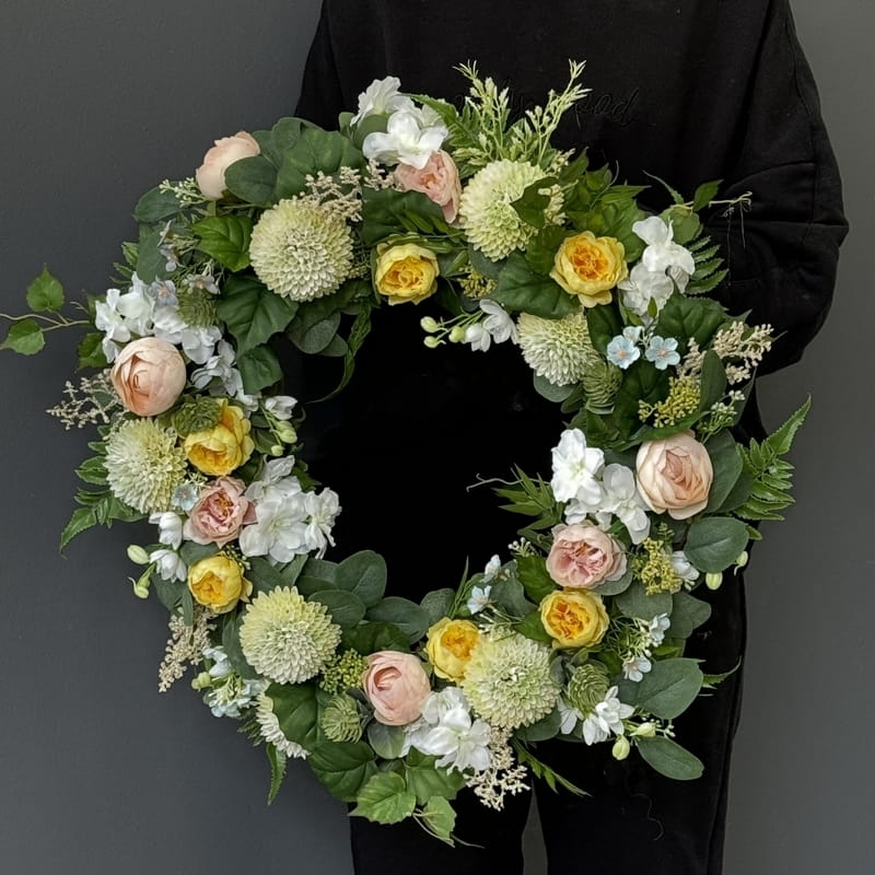 Oryginalny kwiatowy wianek wykonany z wysokiej jakości roślin sztucznych i dodatków. Całość jest stworzona z dbałością o najdrobniejszy szczegół. Podstawę stanowi wianek z tworzywa sztucznego. Wszystkie dodatki są idealnie dopasowane kolorystycznie tak, aby tworzyły spójną całość. Wianek nadaje się zarówno do powieszenia na drzwi, nad kominek jak i do położenia na płytę z dodatkiem znicza. Idealny do sesji fotograficznych.
