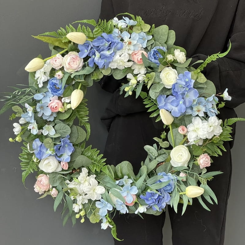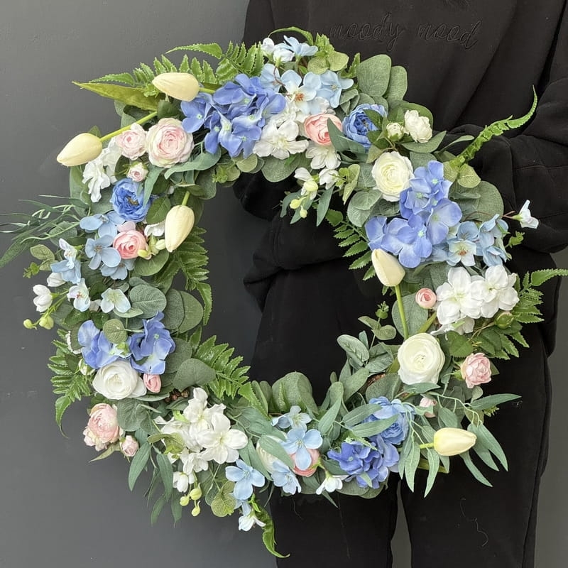 Oryginalny kwiatowy wianek wykonany z wysokiej jakości roślin sztucznych i dodatków. Całość jest stworzona z dbałością o najdrobniejszy szczegół. Podstawę stanowi wianek z tworzywa sztucznego. Wszystkie dodatki są idealnie dopasowane kolorystycznie tak, aby tworzyły spójną całość. Wianek nadaje się zarówno do powieszenia na drzwi, nad kominek jak i do położenia na płytę z dodatkiem znicza. Idealny do sesji fotograficznych.