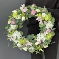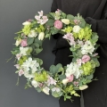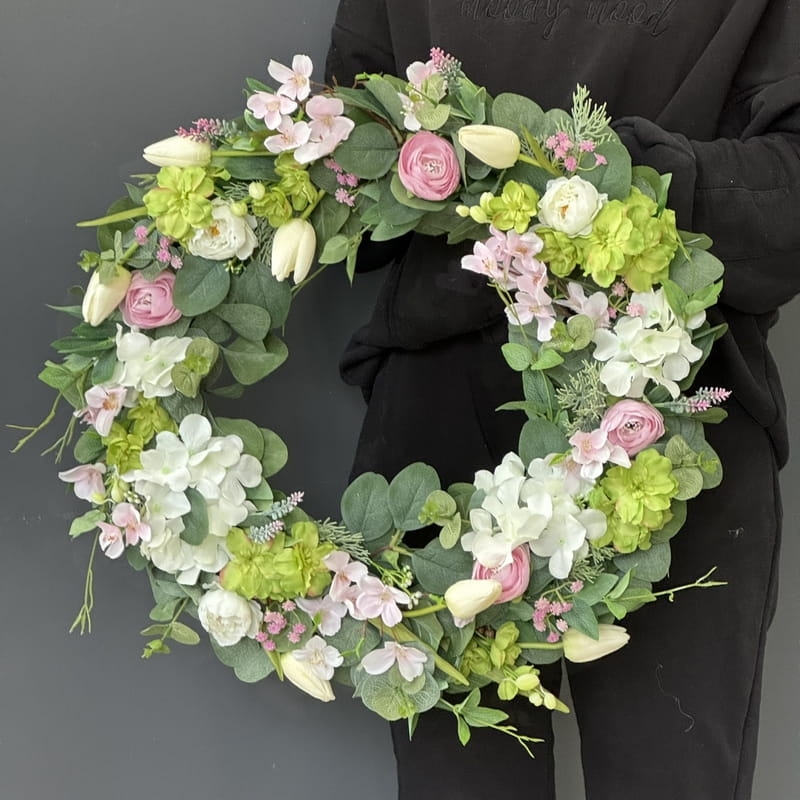 Oryginalny kwiatowy wianek wykonany z wysokiej jakości roślin sztucznych i dodatków. Całość jest stworzona z dbałością o najdrobniejszy szczegół. Podstawę stanowi wianek z tworzywa sztucznego. Wszystkie dodatki są idealnie dopasowane kolorystycznie tak, aby tworzyły spójną całość. Wianek nadaje się zarówno do powieszenia na drzwi, nad kominek jak i do położenia na płytę z dodatkiem znicza. Idealny do sesji fotograficznych.