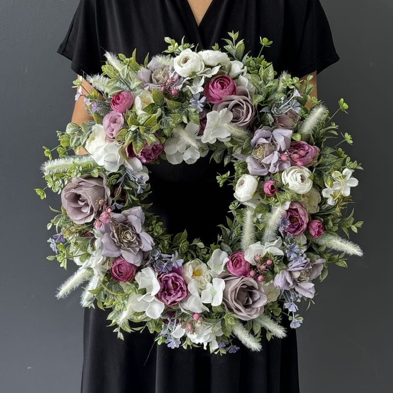 Niezwykle piękny i bogaty wianek wykonany z dużej ilości kwiatów i dodatków. Całość jest stworzona z dbałością o najdrobniejszy szczegół. Wszystkie elementy są idealnie dopasowane kolorystycznie tak, aby tworzyły spójną całość. Poszczególne kompozycje mogą minimalnie różnić się rozkładem i rodzajami kwiatów, w zależności od dostępności, jednak kolorystyka i efekt końcowy są zawsze zachowane.