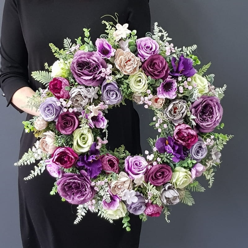 Niezwykle piękny i bogaty wianek wykonany z dużej ilości kwiatów i dodatków. Całość jest stworzona z dbałością o najdrobniejszy szczegół. Wszystkie elementy są idealnie dopasowane kolorystycznie tak, aby tworzyły spójną całość. Poszczególne kompozycje mogą minimalnie różnić się rozkładem i rodzajami kwiatów, w zależności od dostępności, jednak kolorystyka i efekt końcowy są zawsze zachowane.