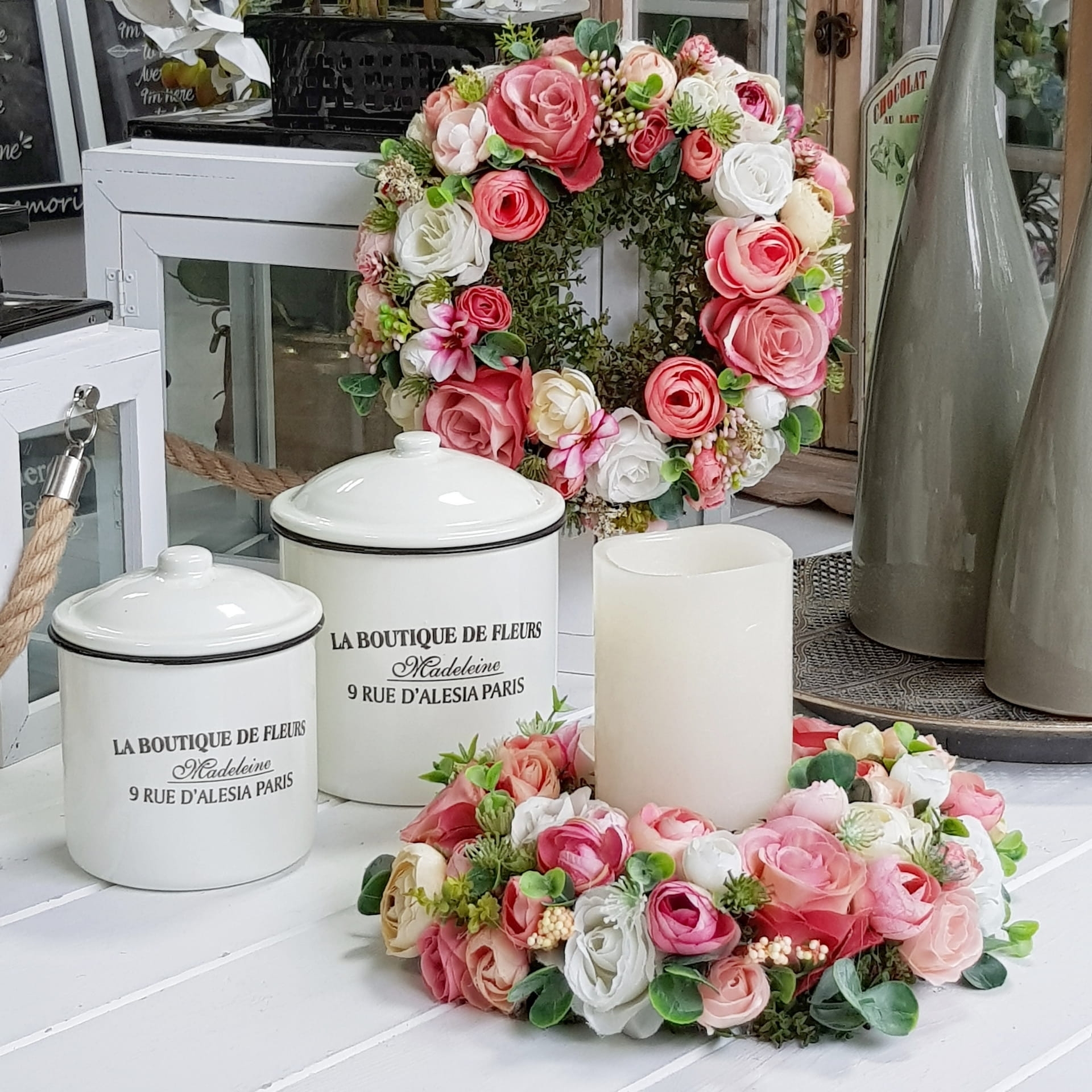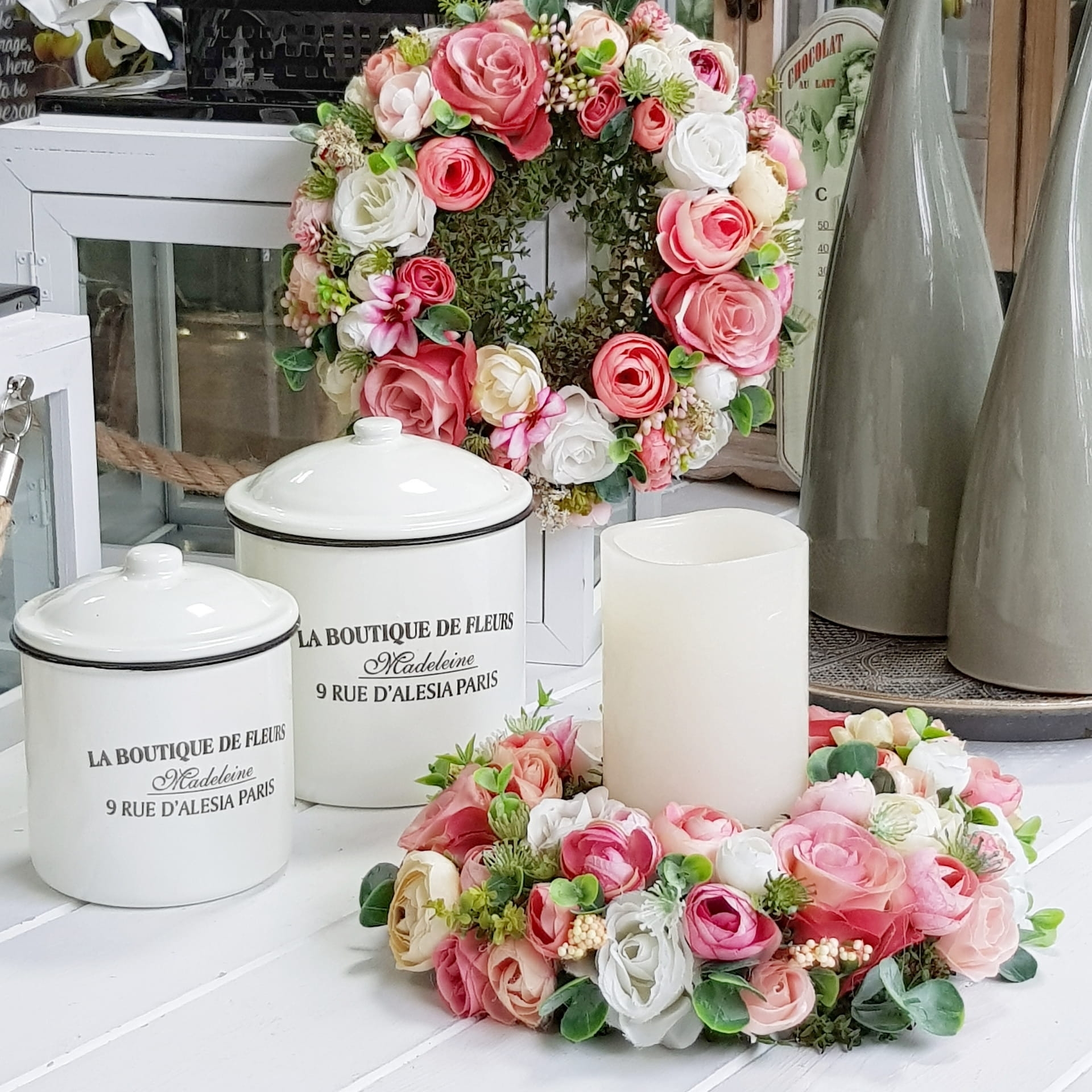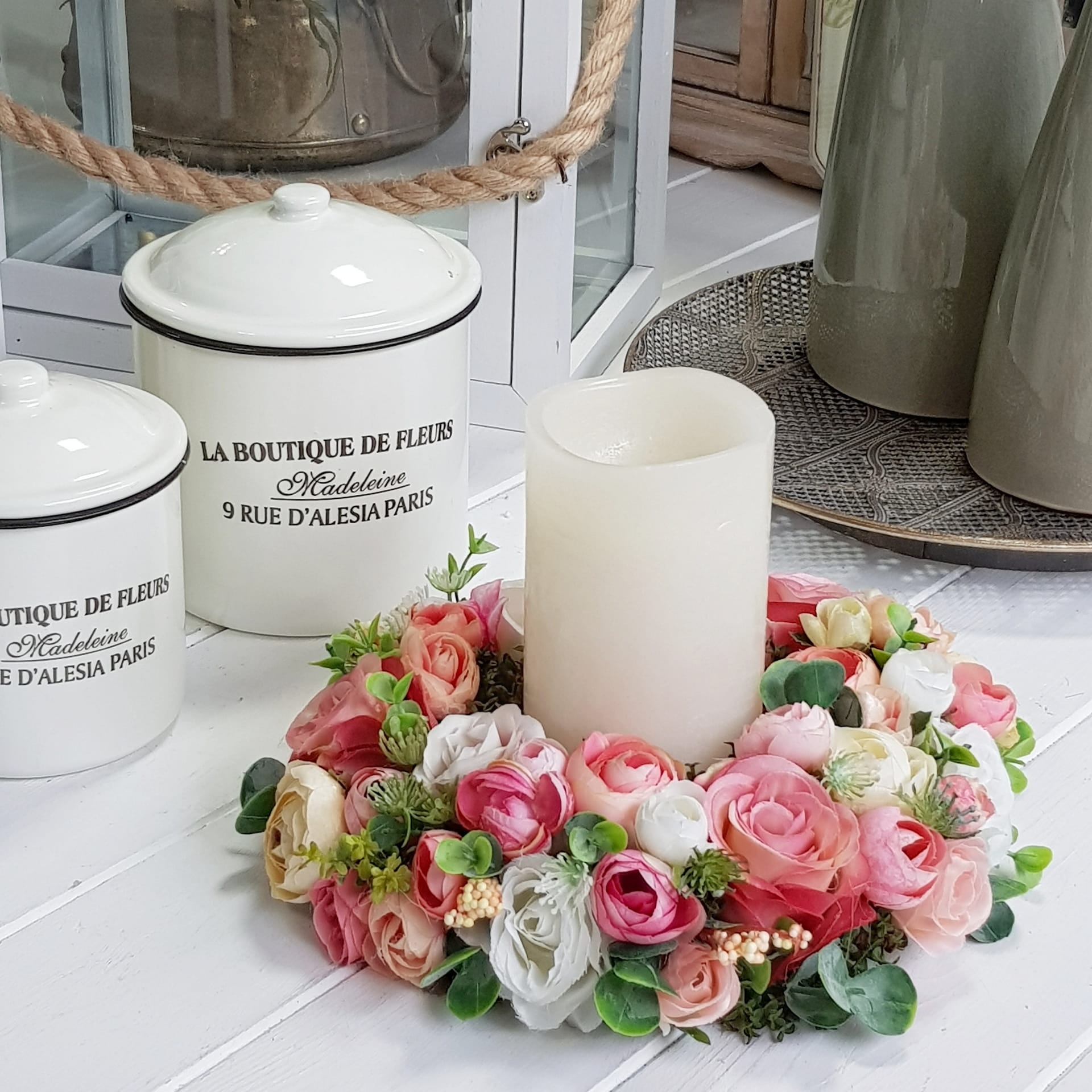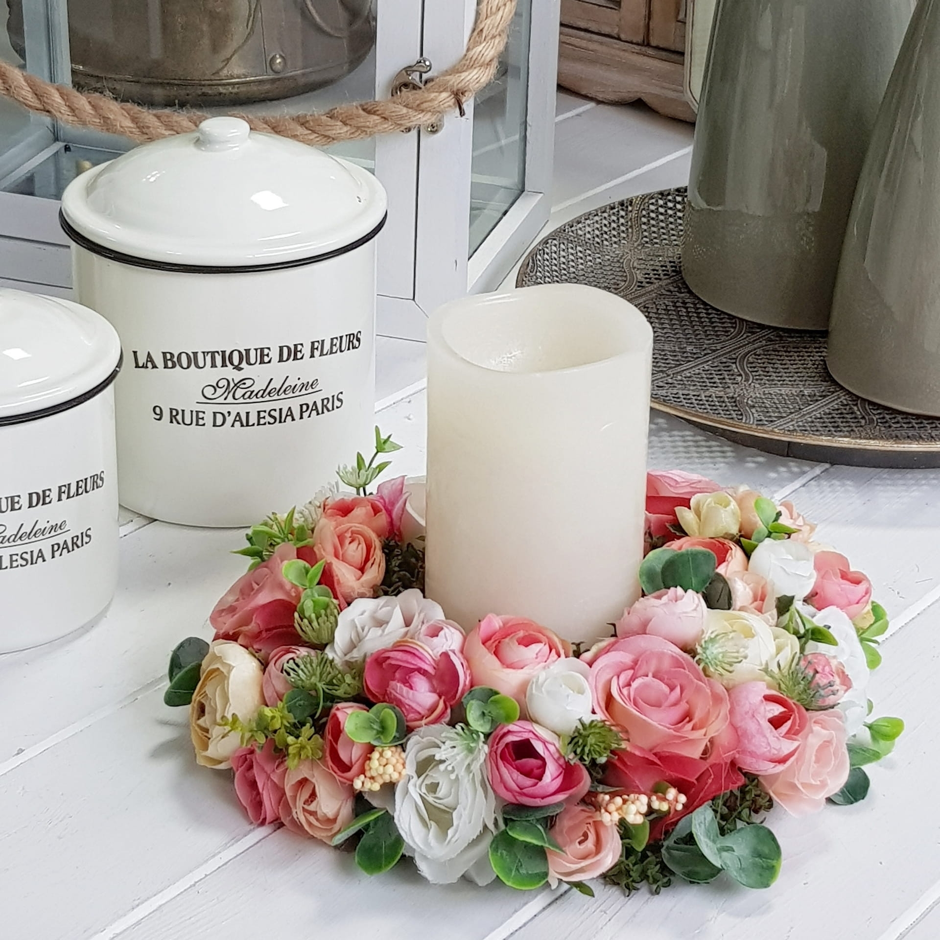 Oryginalny kwiatowy wianek wykonany z wysokiej jakości roślin sztucznych i dodatków. Całość jest stworzona z dbałością o najdrobniejszy szczegół. Podstawę stanowi wianuszek z tworzywa sztucznego. Wszystkie dodatki są idealnie dopasowane kolorystycznie tak, aby tworzyły spójną całość. Wianek nadaje się do wykorzystania ze świecą, szklanym lampionem lub niewielką latarenką. Pięknie również prezentują się w klatkach dekoracyjnych lub latarniach. Wszystkie wianki są wykonywane ręcznie w naszej pracowni. Nie ma dwóch identycznych egzemplarzy. Mogą się minimalnie różnić rodzajem użytych kwiatów lub ich rozkładem. Kolorystyka jest jednak zawsze zachowana. Wewnętrzna średnica wianka to 10 cm, zewnętrzna 25 cm.