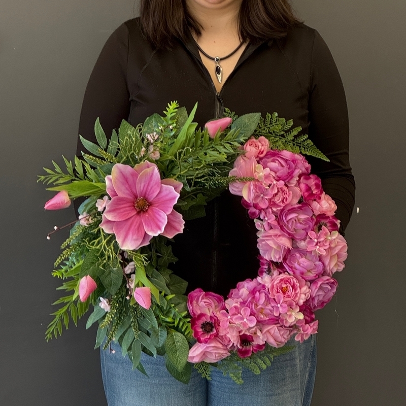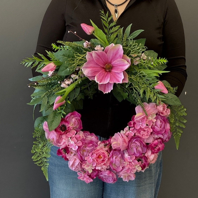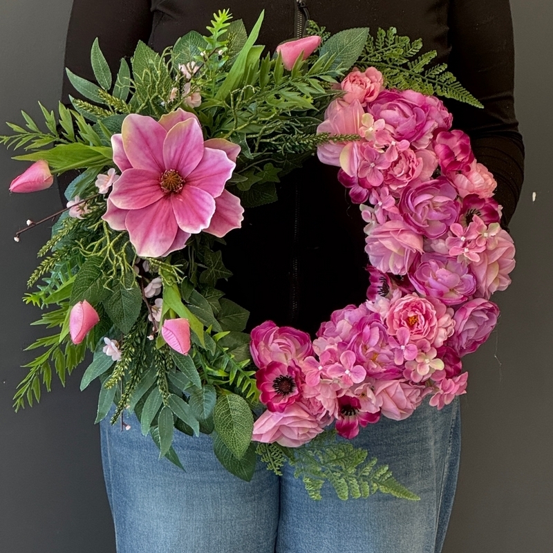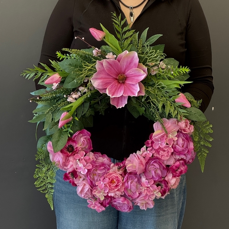 Elegancki wianek, w którym zostały ze sobą zestawione zieleń liści i kwiaty w jednolitej tonacji. Wyjątkowa kompozycja kwiatowa, która łączy w sobie elegancję, harmonię barw oraz wysoką jakość wykonania. W dolnej części dekoracji dominują gęsto ułożone kwiaty w kolorze intensywnej czerwieni, nadające całości wyrazistości i głębi. Całość uzupełniają zielone liście i delikatne gałązki, które wprowadzają naturalny charakter kompozycji.