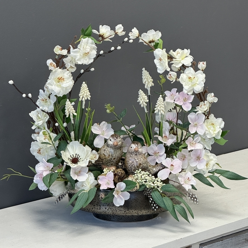 Białe kwiaty inspirowane kwitnącymi gałązkami, delikatna zieleń oraz subtelne detale w postaci dekoracyjnych ptaszków i jajek tworzą spójną, elegancką całość. To ponadczasowa ozdoba, która doskonale sprawdzi się jako dekoracja stołu wielkanocnego, komody, konsoli lub witryny, ale również jako wiosenny akcent na wiele sezonów. Dekoracja nie wymaga pielęgnacji, zachowując swój nienaganny wygląd przez długi czas. Idealna propozycja dla osób ceniących estetykę, jakość i wyjątkowy design. Sprawdzi się także jako stylowy prezent na Wielkanoc lub inaugurację wiosny.
