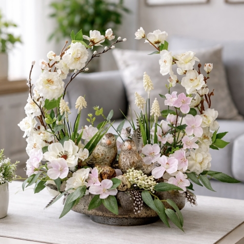 Wiosenna dekoracja z kwiatami i ptaszkami – elegancka kompozycja do domu Minari różowa