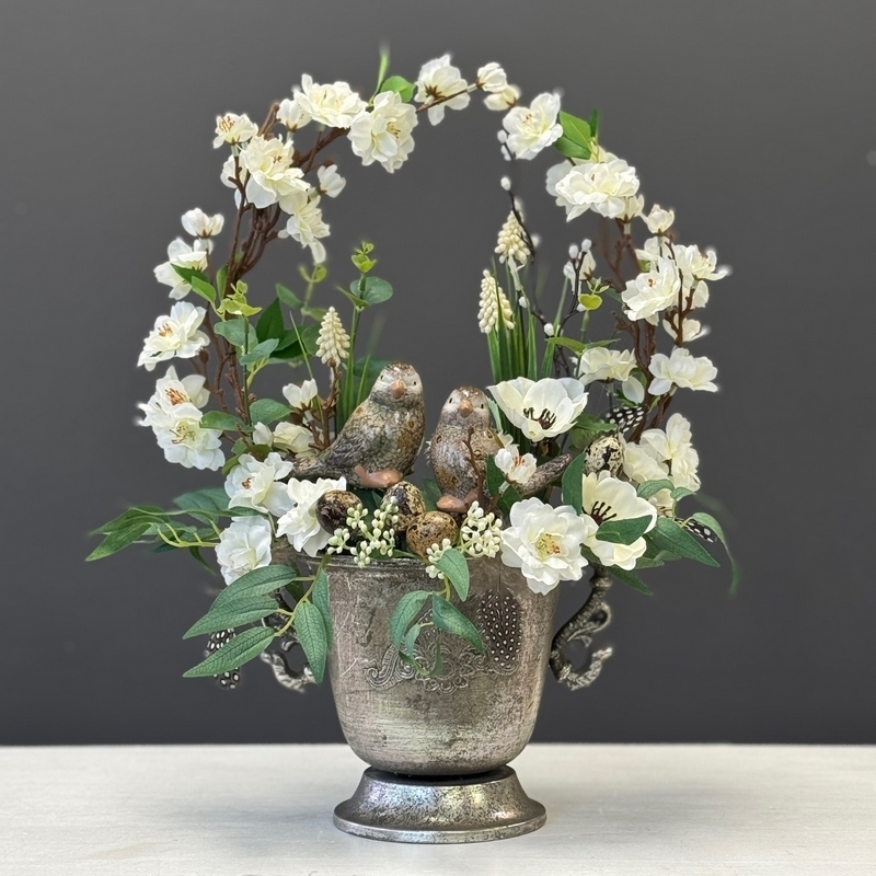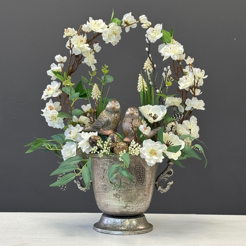 Wiosenna dekoracja z kwiatami i ptaszkami – elegancka kompozycja w donicy Vanita