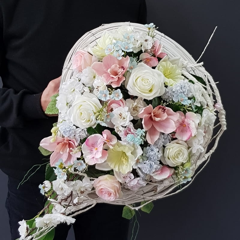 Oryginalna kompozycja roślinna, wykonana z miksu wiosennych kwiatów i zielonych dodatków. Całość została osadzona w rattanowej podstawie w kształcie wrzeciona, obciążonej cementem. Kompozycja służy do położenia na nagrobku. Jest dość ciężka i stabilna.