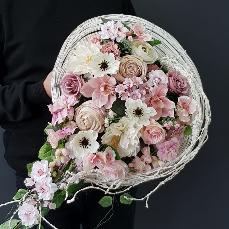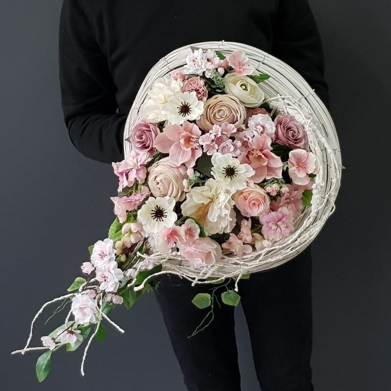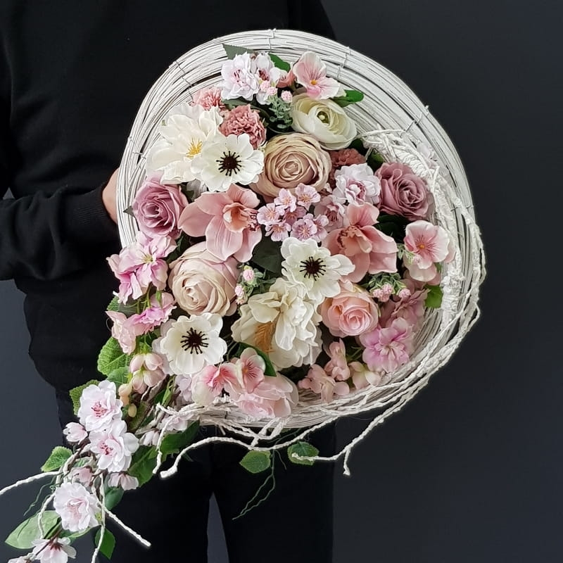 Oryginalna kompozycja roślinna, wykonana z miksu wiosennych kwiatów i zielonych dodatków. Całość została osadzona w rattanowej podstawie w kształcie wrzeciona, obciążonej cementem. Kompozycja służy do położenia na nagrobku. Jest dość ciężka i stabilna.