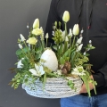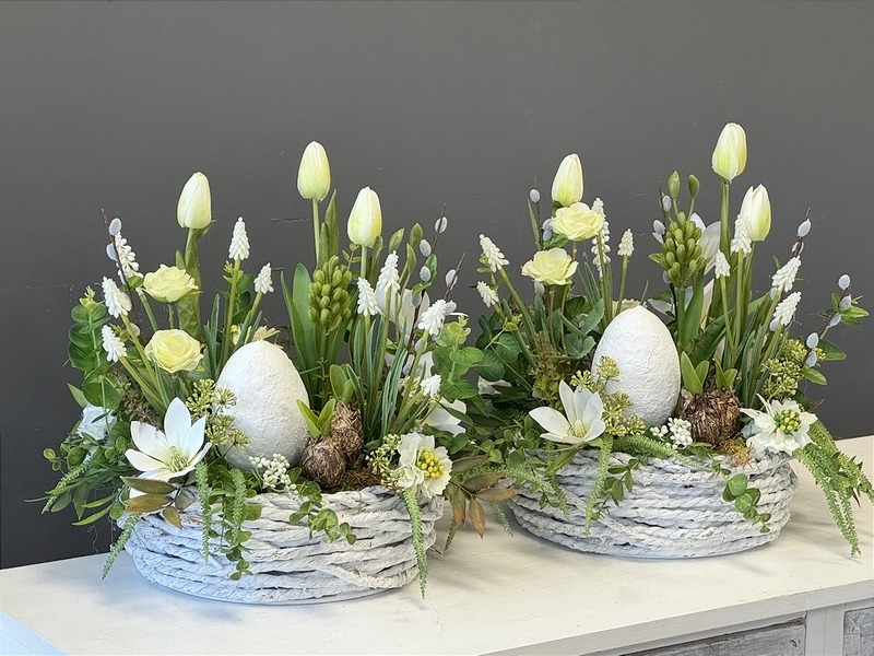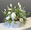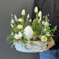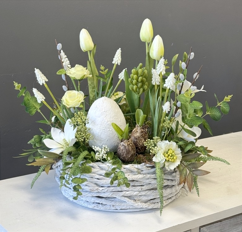 Stylowa, wiosenna kompozycja dekoracyjna w naturalnym koszu to wyjątkowa propozycja zarówno jako ozdoba nagrobna, jak i dekoracja do wnętrza. Subtelna kolorystyka w odcieniach bieli, kremu i zieleni nadaje całości elegancki, spokojny charakter, idealnie wpisujący się w klimat Wielkanocy oraz wiosny.