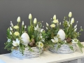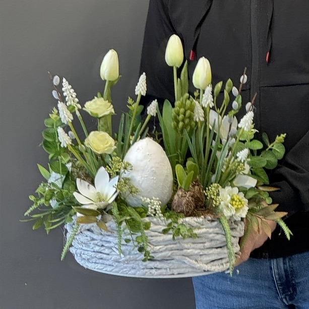 Centralnym elementem kompozycji jest dekoracyjne jajko, symbol odrodzenia i życia, otoczone starannie dobranymi sztucznymi kwiatami i roślinami. W aranżacji znajdują się m.in. tulipany, drobne kwiaty wiosenne oraz realistyczna zieleń, które razem tworzą harmonijną i lekką formę. Całość została wykonana z wysokiej jakości materiałów, dzięki czemu kompozycja zachowuje swój piękny wygląd przez długi czas – bez konieczności pielęgnacji.