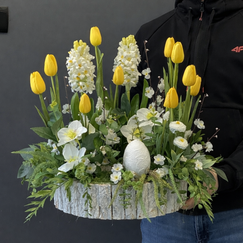 Centralnym elementem kompozycji jest dekoracyjne jajko, symbol odrodzenia i życia, otoczone starannie dobranymi sztucznymi kwiatami i roślinami. W aranżacji znajdują się m.in. tulipany, drobne kwiaty wiosenne oraz realistyczna zieleń, które razem tworzą harmonijną i lekką formę. Całość została wykonana z wysokiej jakości materiałów, dzięki czemu kompozycja zachowuje swój piękny wygląd przez długi czas – bez konieczności pielęgnacji.