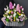 Oryginalna kompozycja roślinna, wykonana z miksu wiosennych kwiatów i zielonych dodatków. Całość została osadzona w drewnianej donicy obciążonej cementem i pokrytej korą. Kompozycja ma wiele uroku i uniwersalne zastosowanie. Sprawdzi się zarówno jako wiosenna kompozycja nagrobna, jak również jako dekoracja do domu, na taras czy do ogrodu. Jest dość ciężka i stabilna. Ze względu na celowe postarzenia donicy, przypomina styl rustykalny.