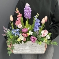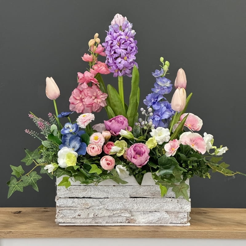 Oryginalna kompozycja roślinna, wykonana z miksu wiosennych kwiatów i zielonych dodatków. Całość została osadzona w drewnianej donicy obciążonej cementem i pokrytej korą. Kompozycja ma wiele uroku i uniwersalne zastosowanie. Sprawdzi się zarówno jako wiosenna kompozycja nagrobna, jak również jako dekoracja do domu, na taras czy do ogrodu. Jest dość ciężka i stabilna. Ze względu na celowe postarzenia donicy, przypomina styl rustykalny.