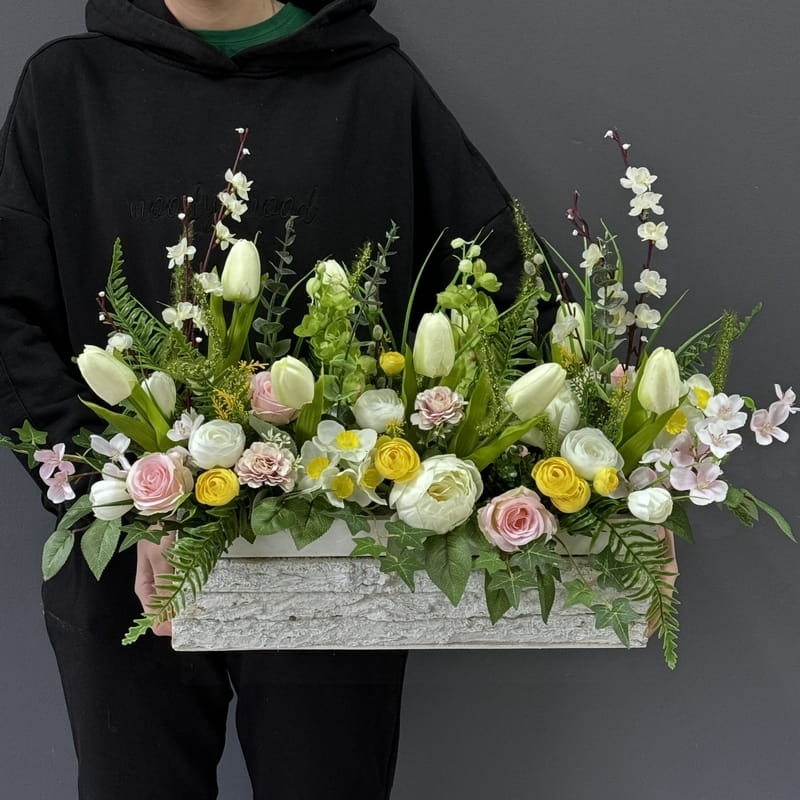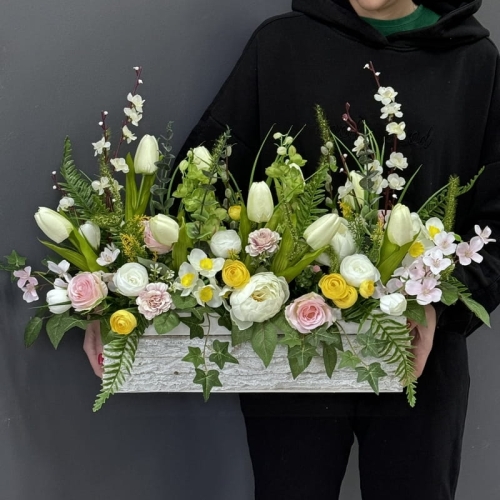 Oryginalna kompozycja roślinna, wykonana z miksu wiosennych kwiatów i zielonych dodatków. Całość została osadzona w drewnianej donicy obciążonej cementem i pokrytej korą. Kompozycja ma wiele uroku i uniwersalne zastosowanie. Sprawdzi się zarówno jako wiosenna kompozycja nagrobna, jak również jako dekoracja do domu, na taras czy do ogrodu. Jest dość ciężka i stabilna. Ze względu na celowe postarzenia donicy, przypomina styl rustykalny.