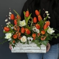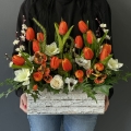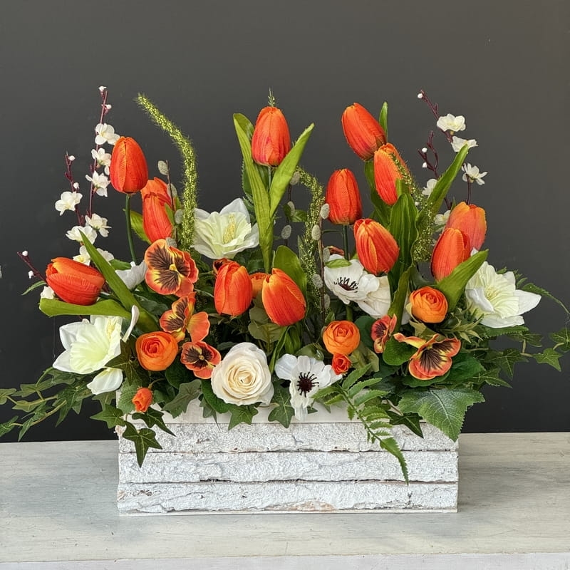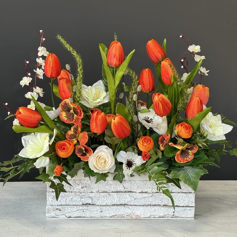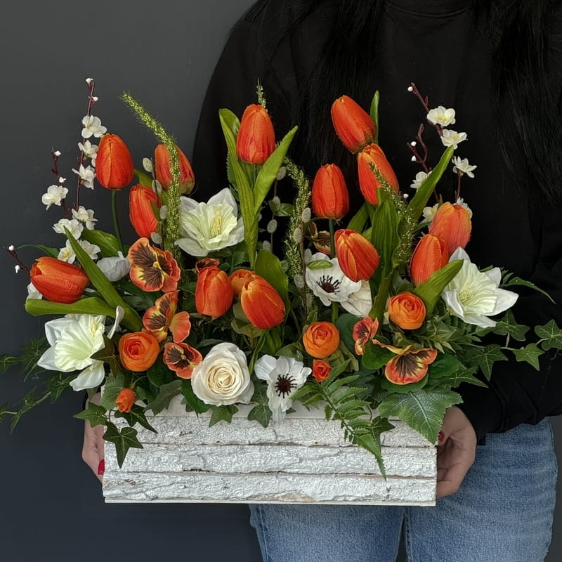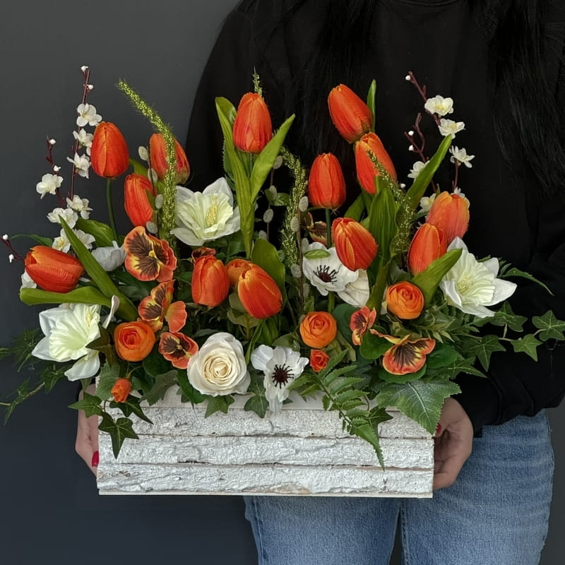 Oryginalna kompozycja roślinna, wykonana z miksu wiosennych kwiatów i zielonych dodatków. Całość została osadzona w drewnianej donicy obciążonej cementem i pokrytej korą. Kompozycja ma wiele uroku i uniwersalne zastosowanie. Sprawdzi się zarówno jako wiosenna kompozycja nagrobna, jak również jako dekoracja do domu, na taras czy do ogrodu. Jest dość ciężka i stabilna. Ze względu na celowe postarzenia donicy, przypomina styl rustykalny.