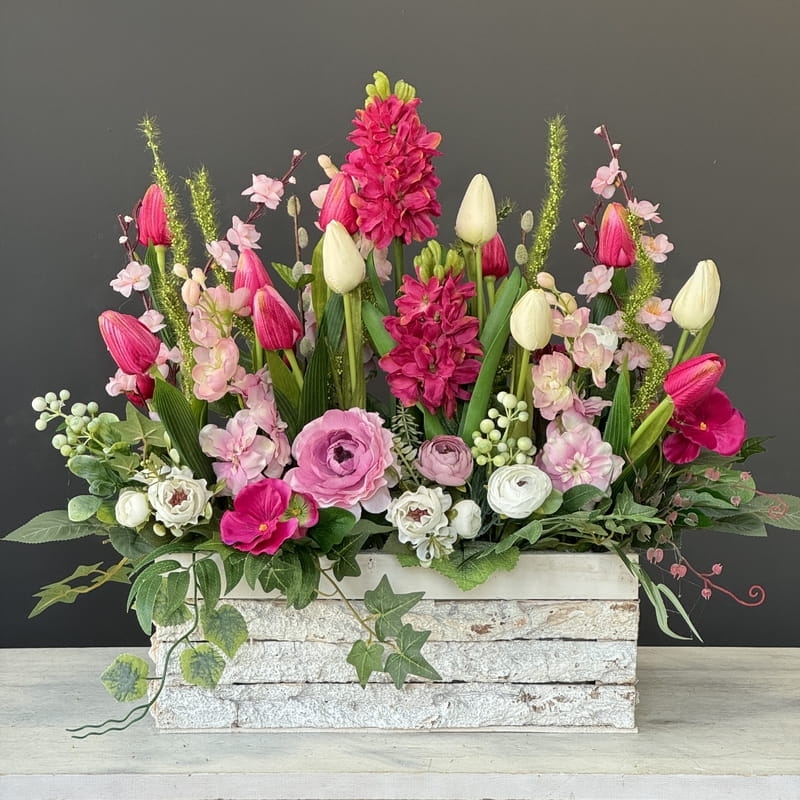 Oryginalna kompozycja roślinna, wykonana z miksu wiosennych kwiatów i zielonych dodatków. Całość została osadzona w drewnianej donicy obciążonej cementem i pokrytej korą. Kompozycja ma wiele uroku i uniwersalne zastosowanie. Sprawdzi się zarówno jako wiosenna kompozycja nagrobna, jak również jako dekoracja do domu, na taras czy do ogrodu. Jest dość ciężka i stabilna. Ze względu na celowe postarzenia donicy, przypomina styl rustykalny.
