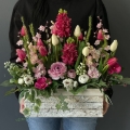 Wiosenna kompozycja ogródek hiacynty donica drewno Paela L róż amarant