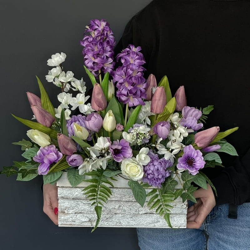 Wiosenna kompozycja ogródek hiacynty donica drewno Perla M biało-fioletowa