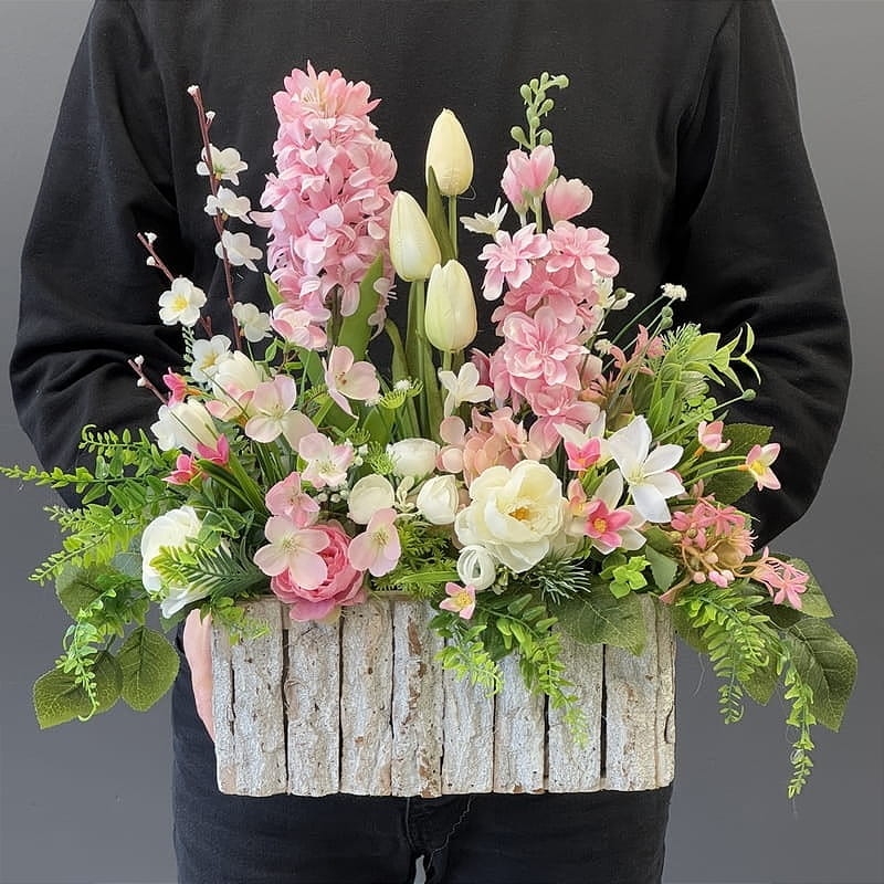Kompozycja sztucznych kwiatów wiosennych, takich jak hiacynty i tulipany, została wykonana z materiałów wysokiej jakości, wiernie odwzorowujących naturalny wygląd roślin. Kwiaty umieszczono w postarzałej drewnianej donicy wykonanej z kory drewna, która dodaje całości rustykalnego uroku i naturalnego charakteru. Donica została dodatkowo obciążona cementem, co zapewnia stabilność i trwałość kompozycji. Starannie dopracowane detale sprawiają, że dekoracja prezentuje się elegancko i realistycznie.