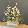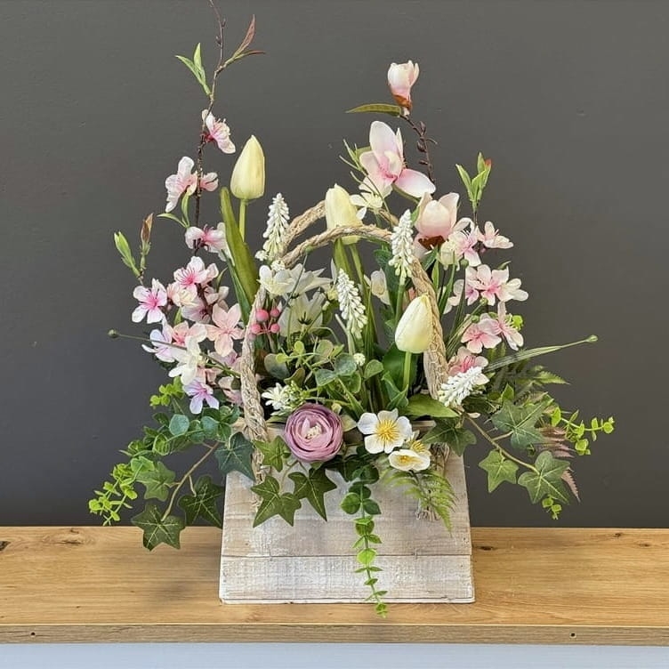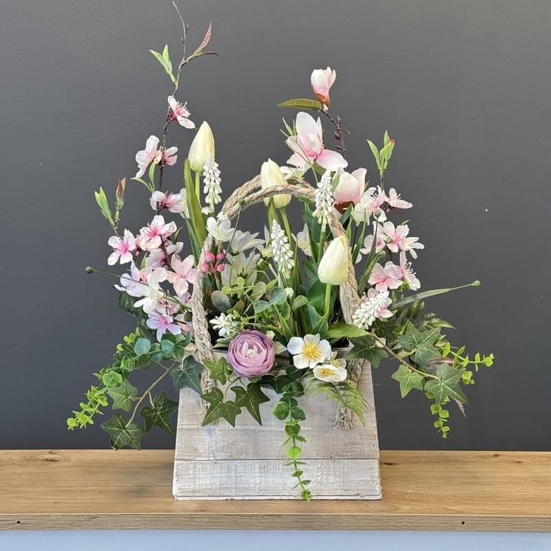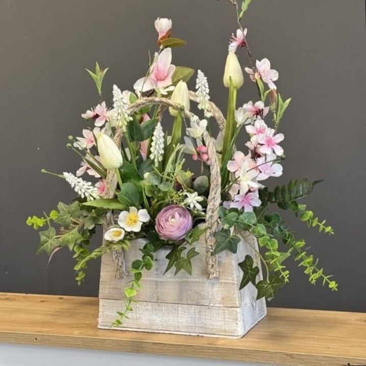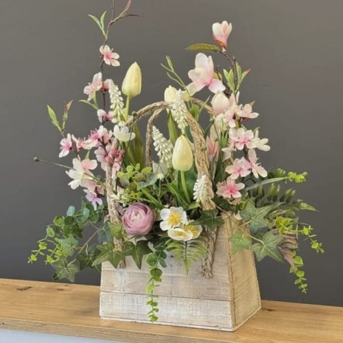 Kompozycja sztucznych kwiatów wiosennych, wykonanych z materiałów wysokiej jakości, została umieszczona w postarzałej drewnianej donicy w kształcie koszyka z uchwytem. Realistyczne odwzorowanie kwiatów, takich jak tulipany, szafirki, kaczeńce czy inne wiosenne gatunki, nadaje całości naturalnego i eleganckiego wyglądu. Postarzana struktura koszyka z drewna dodaje dekoracji rustykalnego uroku, a uchwyt podkreśla praktyczny i dekoracyjny charakter kompozycji. Donica została dodatkowo obciążona cementem, co zapewnia stabilność i trwałość.