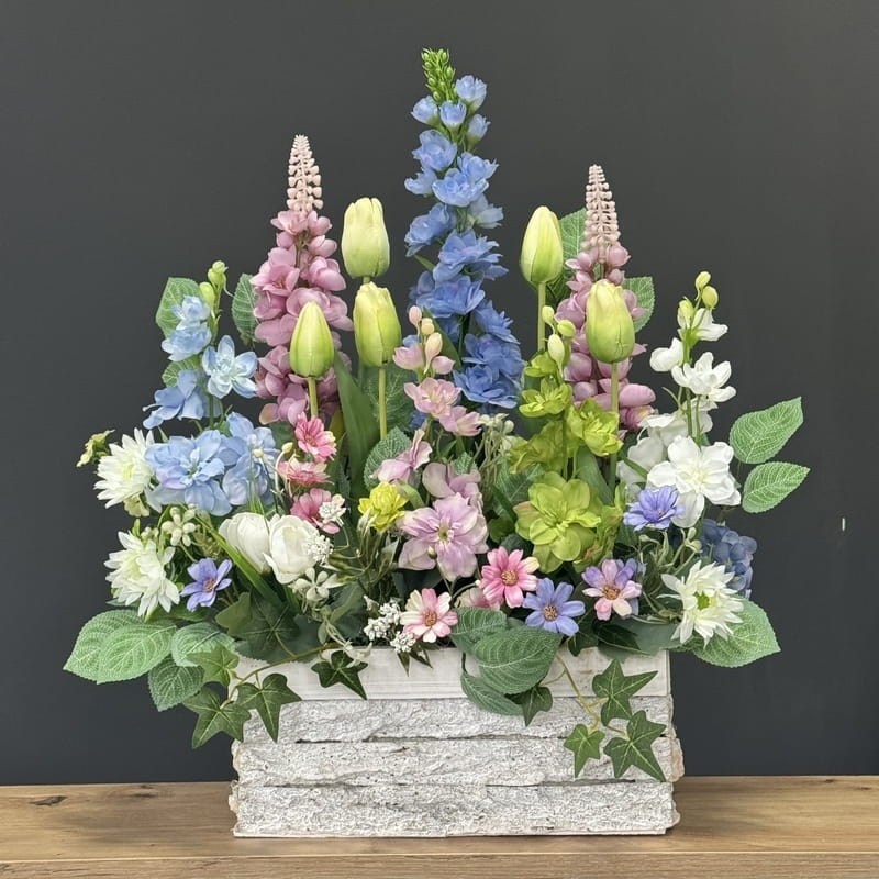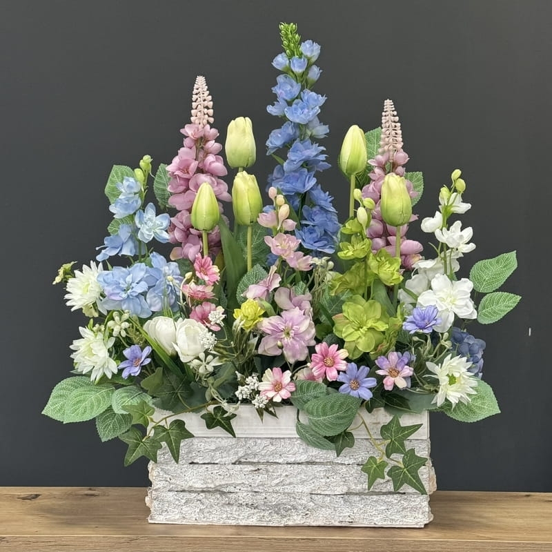 Oryginalna kompozycja roślinna, wykonana z miksu wiosennych kwiatów i zielonych dodatków. Całość została osadzona w drewnianej donicy obciążonej cementem i pokrytej korą. Kompozycja ma wiele uroku i uniwersalne zastosowanie. Sprawdzi się zarówno jako wiosenna kompozycja nagrobna, jak również jako dekoracja do domu, na taras czy do ogrodu. Jest dość ciężka i stabilna. Ze względu na celowe postarzenia donicy, przypomina styl rustykalny.