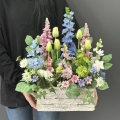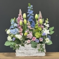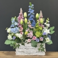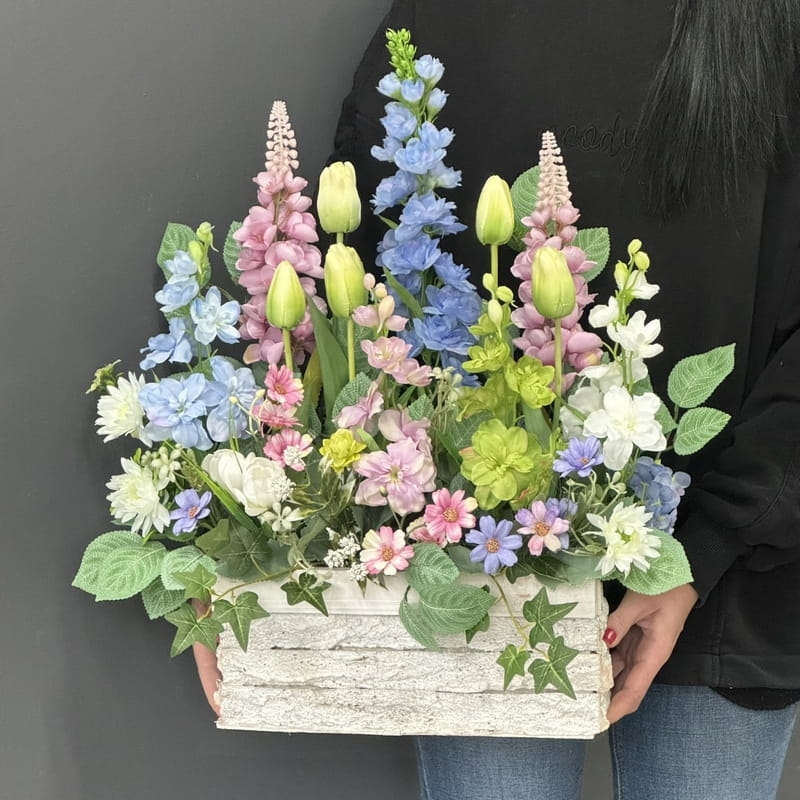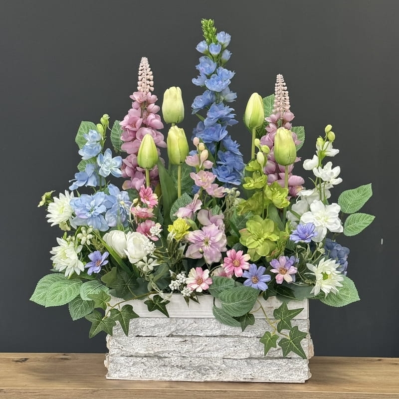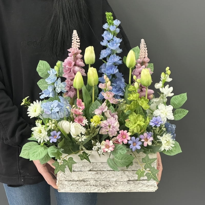 Wiosenna kompozycja ogródek ostróżki donica drewno Estera M wz.3