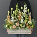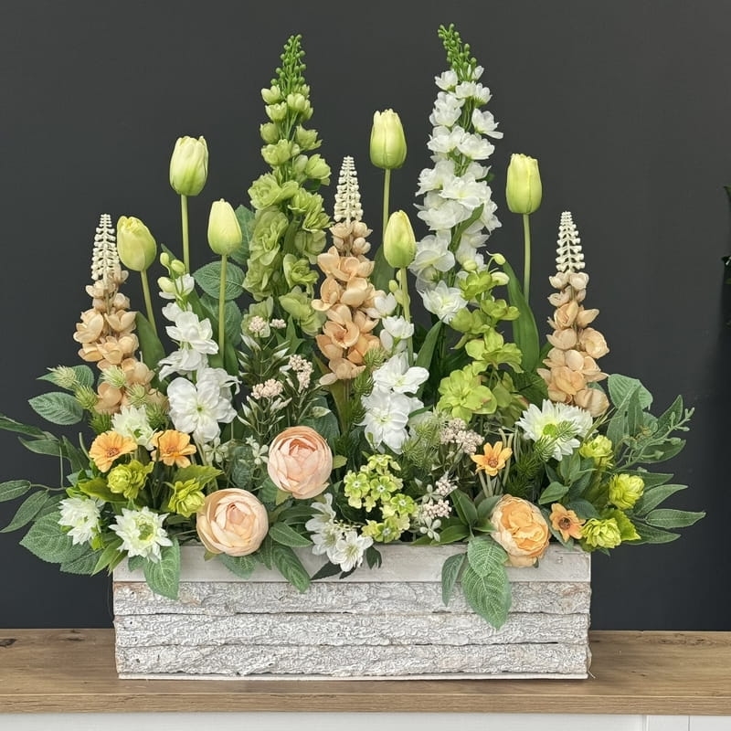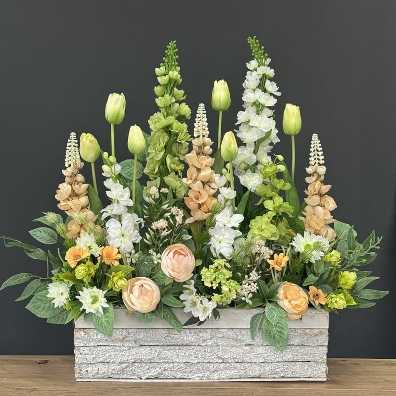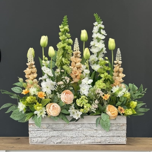 Oryginalna kompozycja roślinna, wykonana z miksu wiosennych kwiatów i zielonych dodatków. Całość została osadzona w drewnianej donicy obciążonej cementem i pokrytej korą. Kompozycja ma wiele uroku i uniwersalne zastosowanie. Sprawdzi się zarówno jako wiosenna kompozycja nagrobna, jak również jako dekoracja do domu, na taras czy do ogrodu. Jest dość ciężka i stabilna. Ze względu na celowe postarzenia donicy, przypomina styl rustykalny.